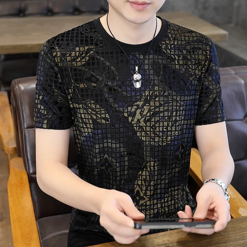 Herren Rundhals-T-Shirt aus leichtem Luxus-Samt mit floralem Druck für Freizeit und Business