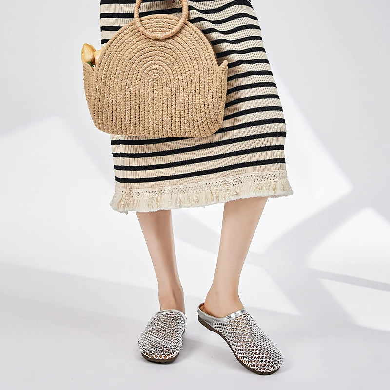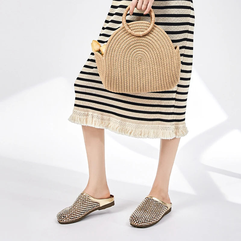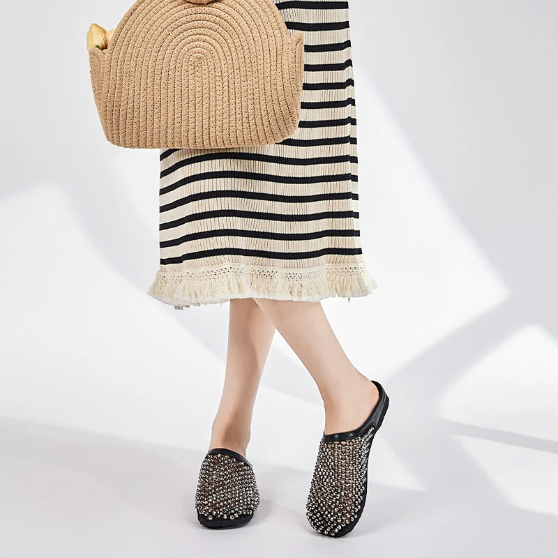 Diese Hausschuhe sind mit einem rutschfesten Obermaterial aus Diamantnetz gefertigt und sorgen für Sicherheit und Komfort bei Sommerspaziergängen.