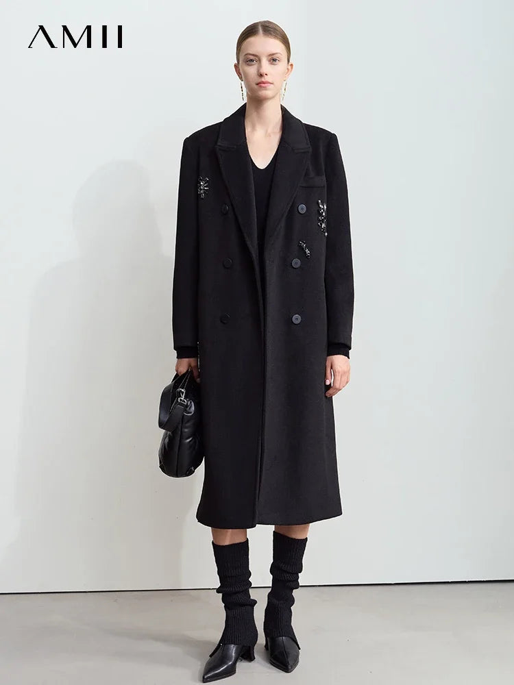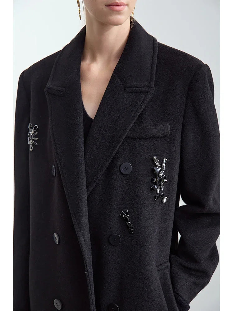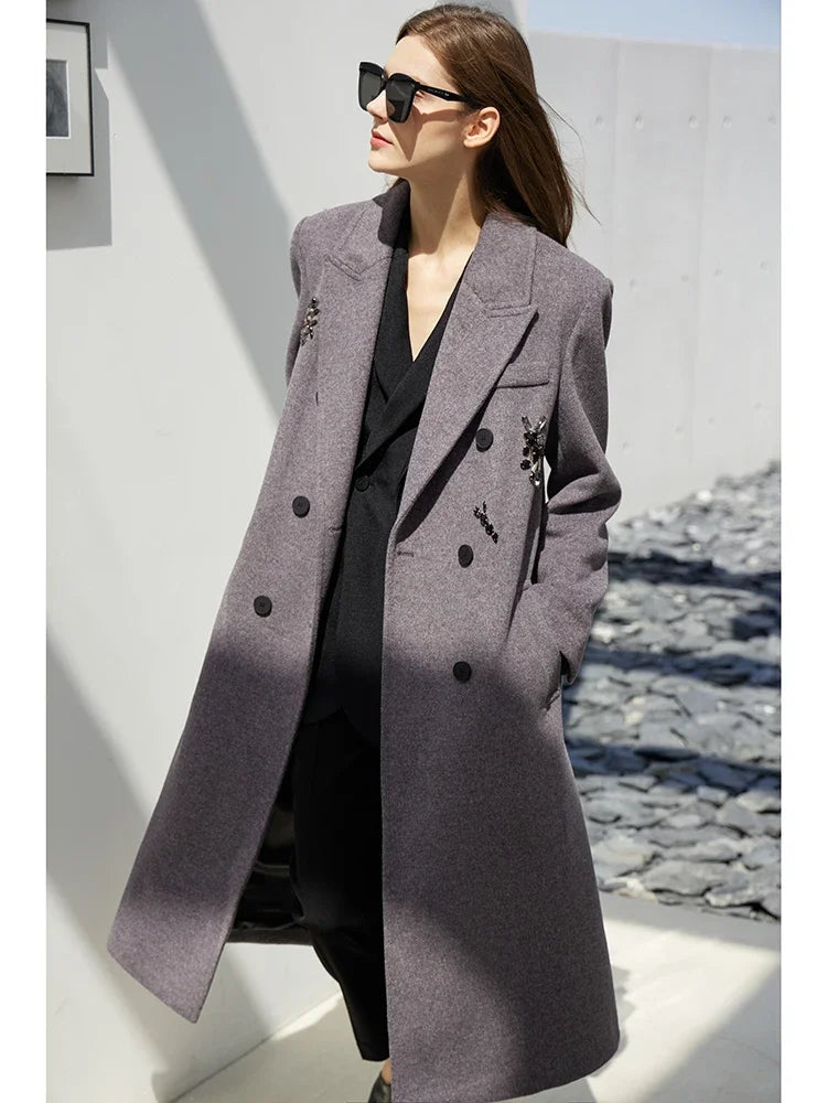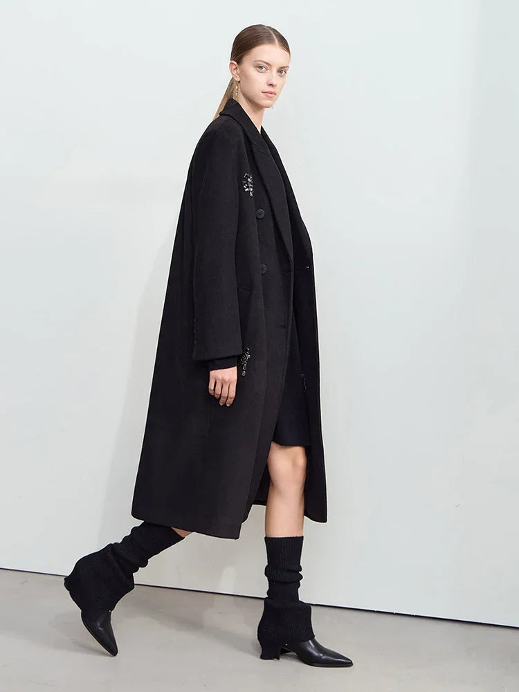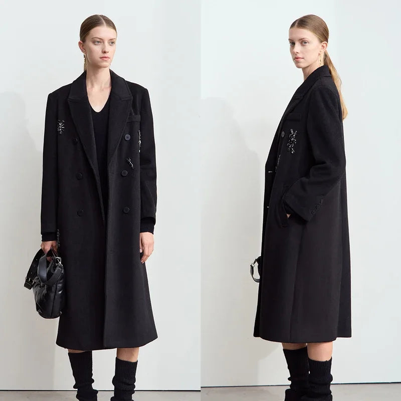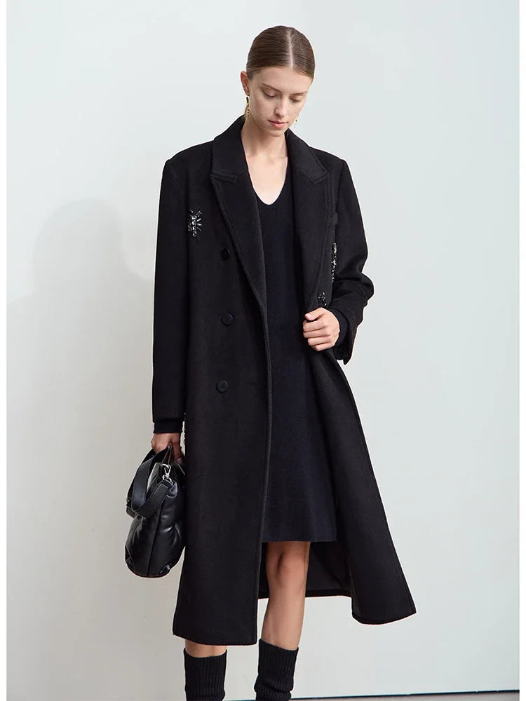 Damen langer Mantel mit geschlossenen Kragen und dekorativen Applikationen