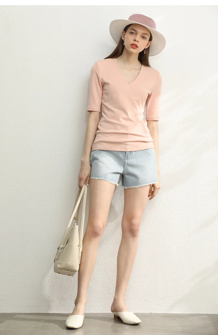 Damen T-Shirt im Minimalismus-Stil mit V-Ausschnitt und halben Ärmeln
