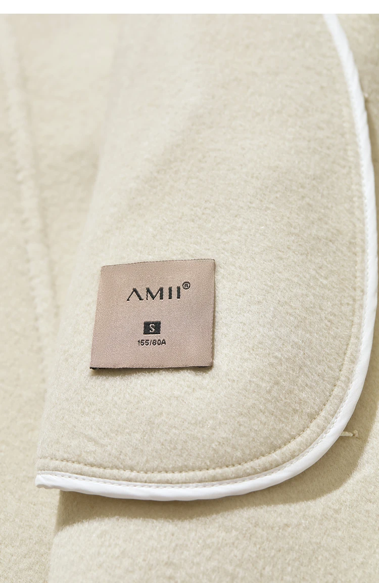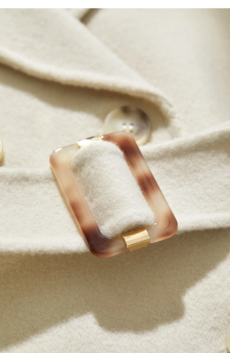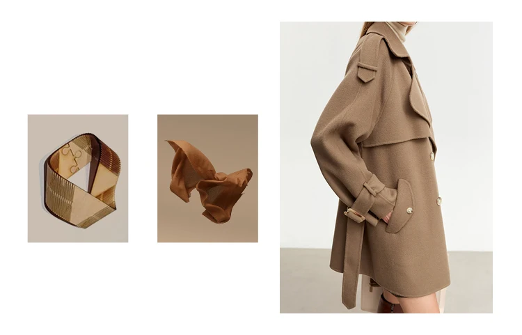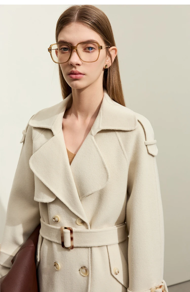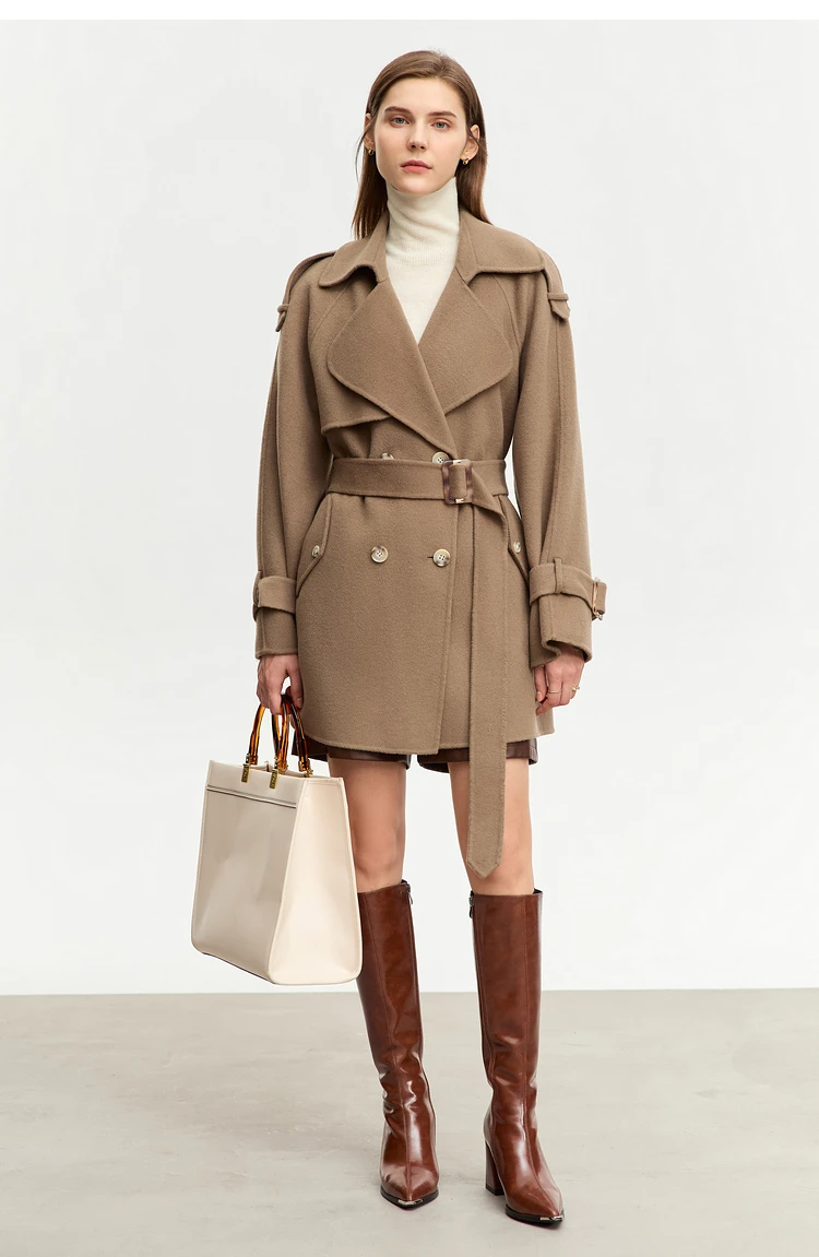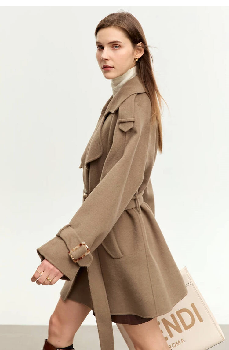 Damen Mid-Length Wollmantel im minimalistischen Stil mit Gürtel und Taschen