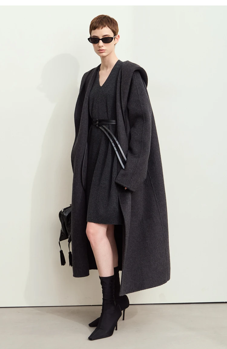 Damen Winter Festmantel mit Gürtel und Kapuze im minimalistischen Stil