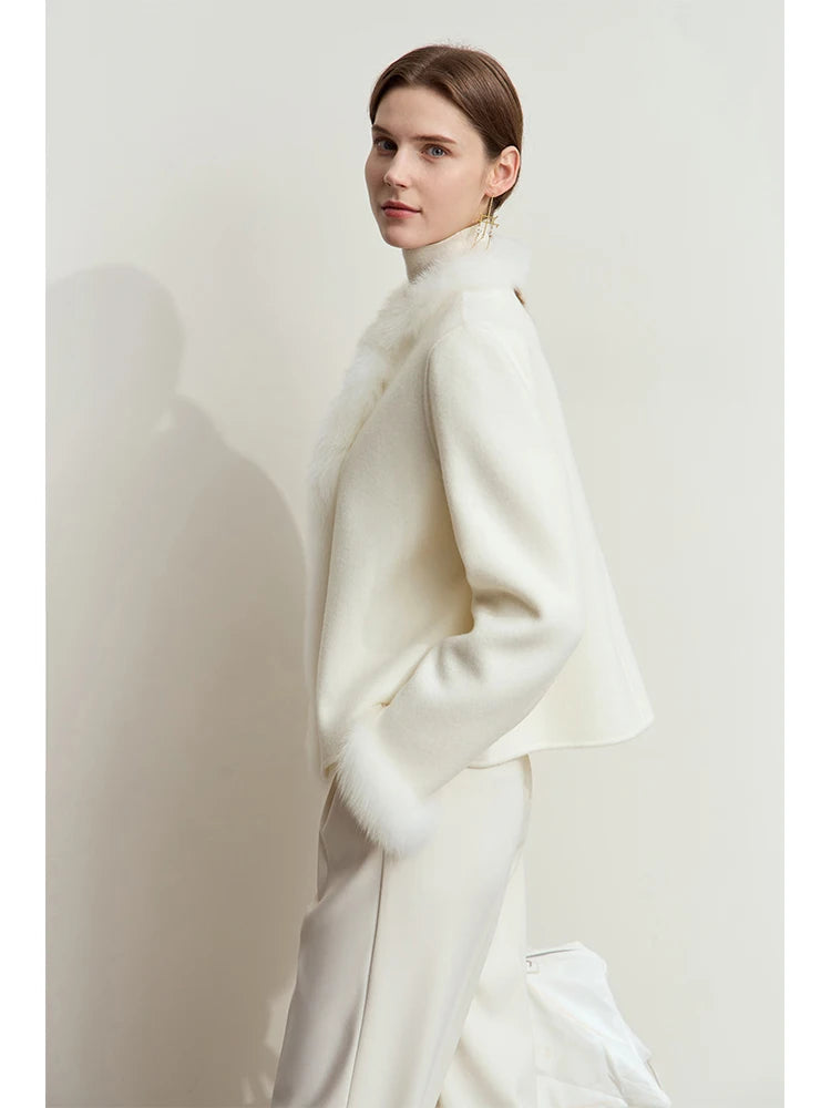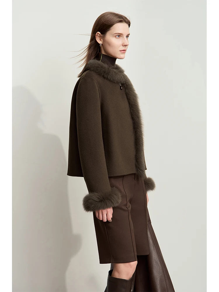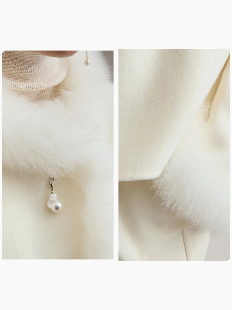 Damen Wollmantel im minimalistischen Design mit doppelseitigem Fuchshaarkragen