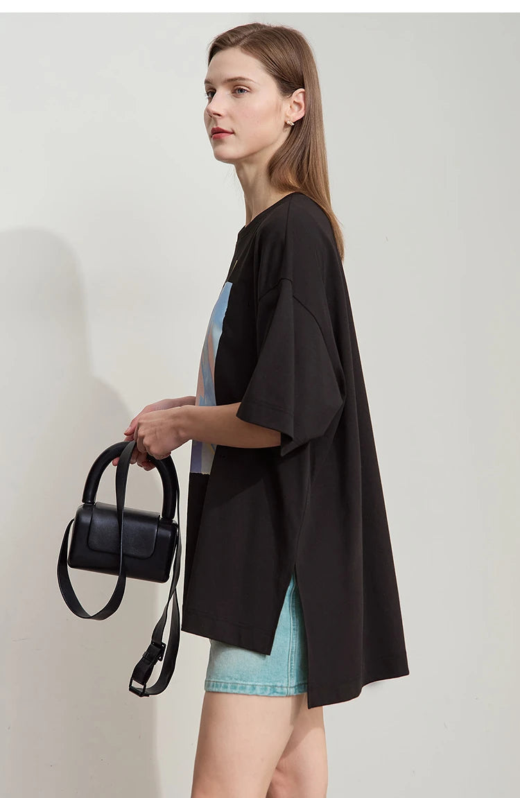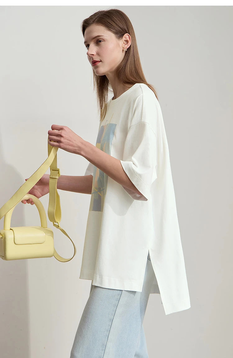Damen T-Shirt im minimalistischen Design mit unregelmäßigem Schnitt und abstraktem Druck