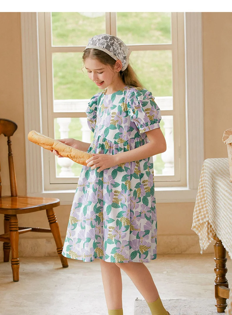 Kurzes Mädchen-Kleid mit Puffärmeln und Cheongsam-Design, Patchwork aus Gaze in Lila-Blau, mit Perlenknöpfen – für Kinder von 3 bis 12 Jahren.