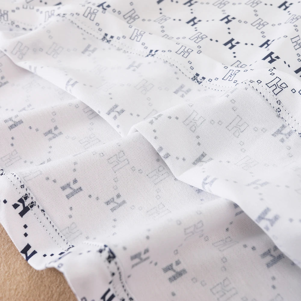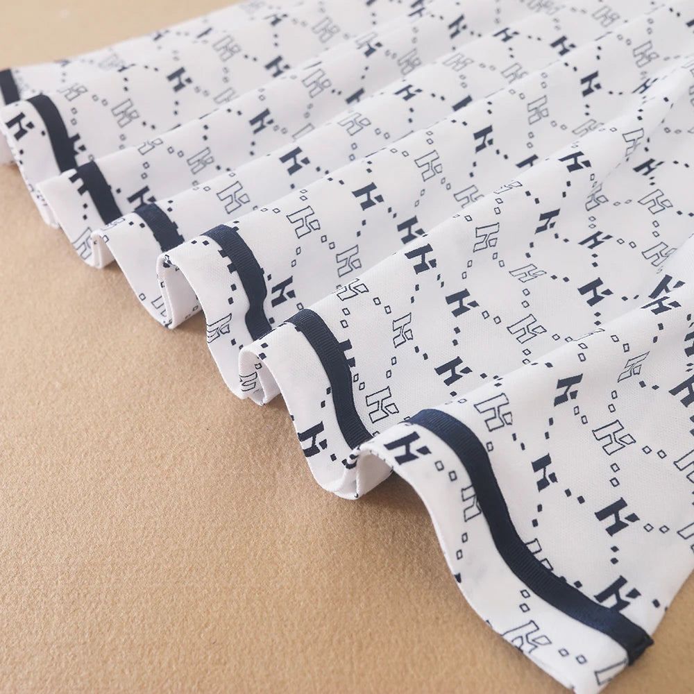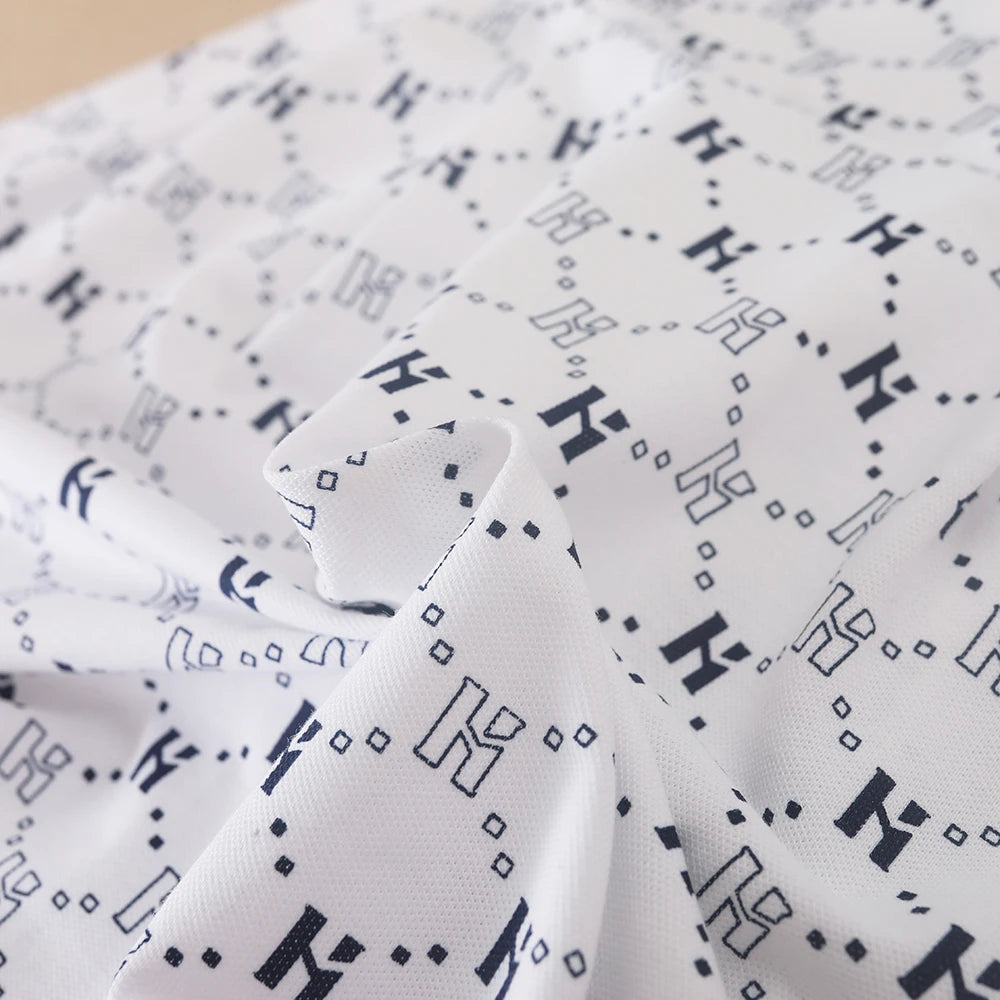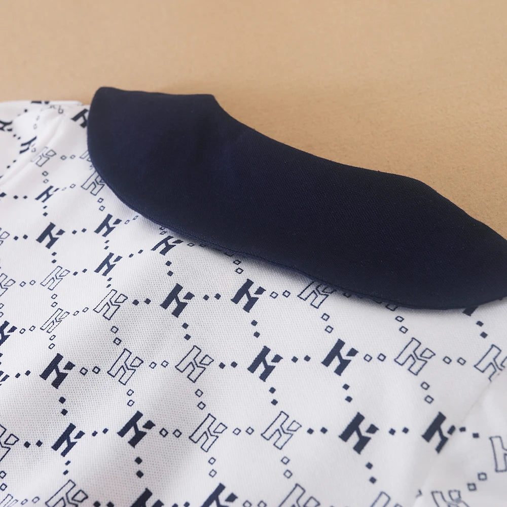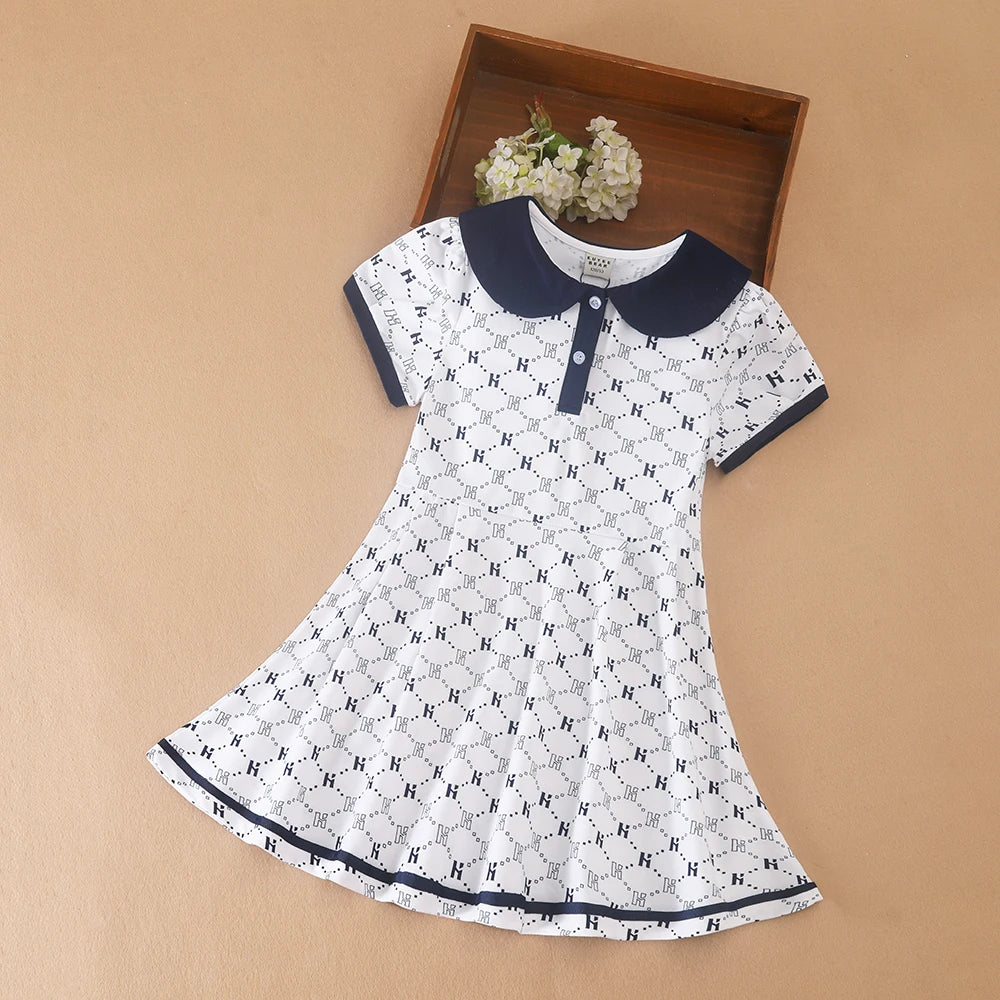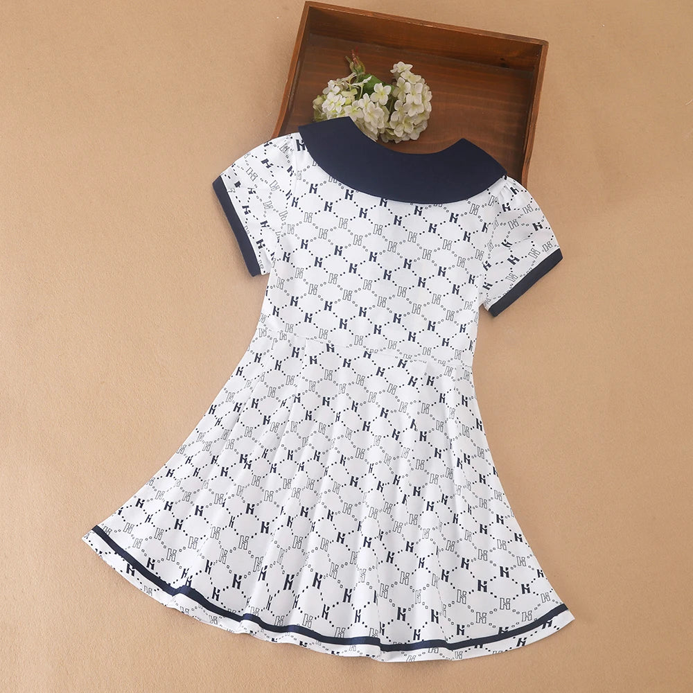 Bedrucktes Polokleid für Mädchen mit marineblauem Kragen, kurzärmliges A-Linien-Kleid mit Monogramm-Muster, weiße Sommerkleider für Kinder