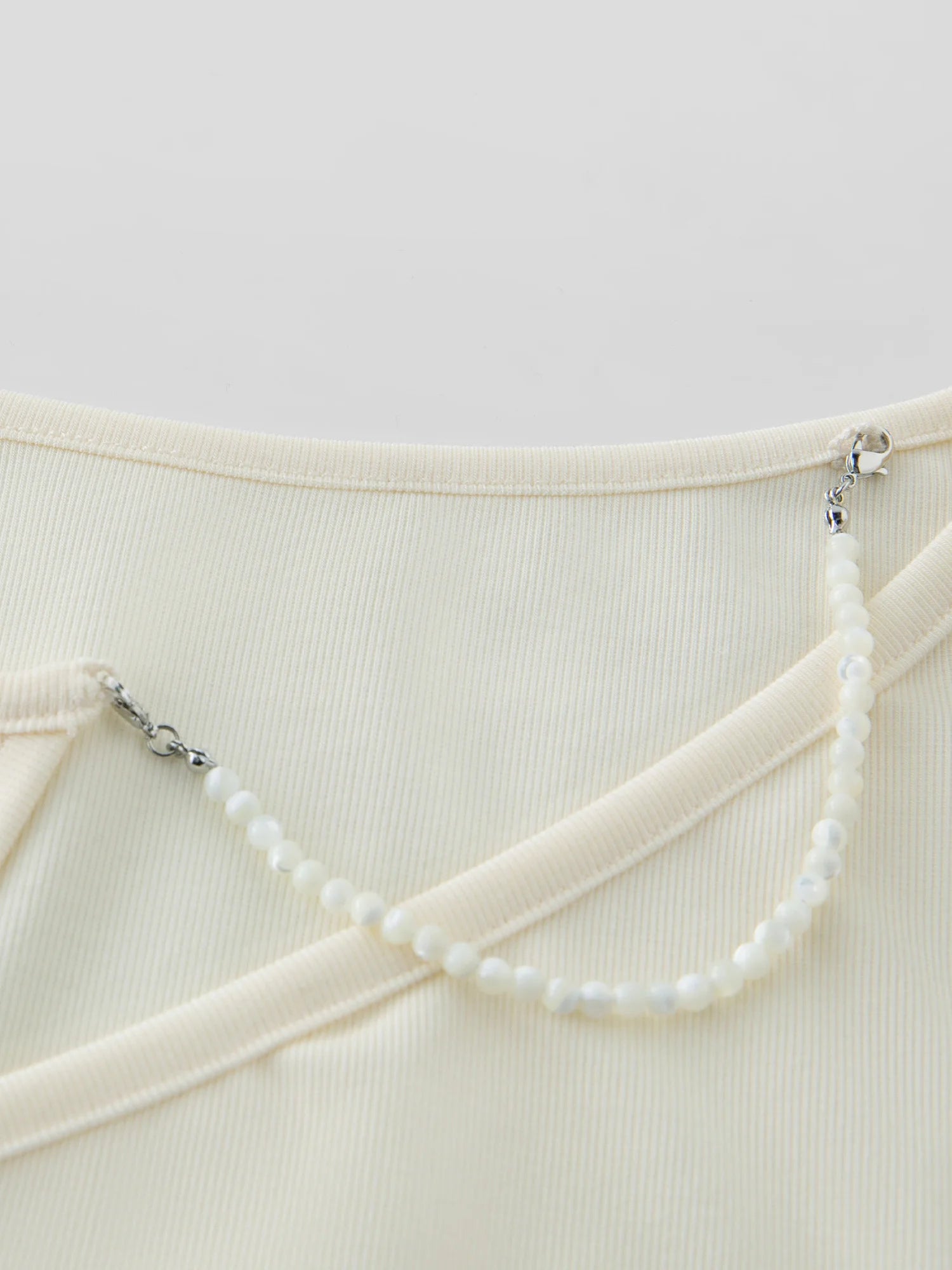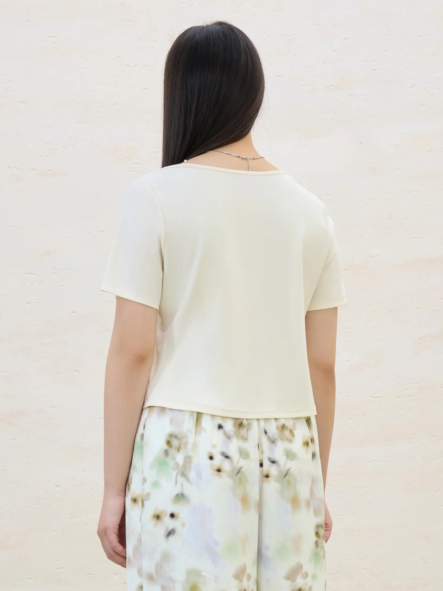 Beige Damenbluse mit Puffärmeln und Umlegekragen, einreihig mit Knopfverzierung – leichtes, kurzes Design