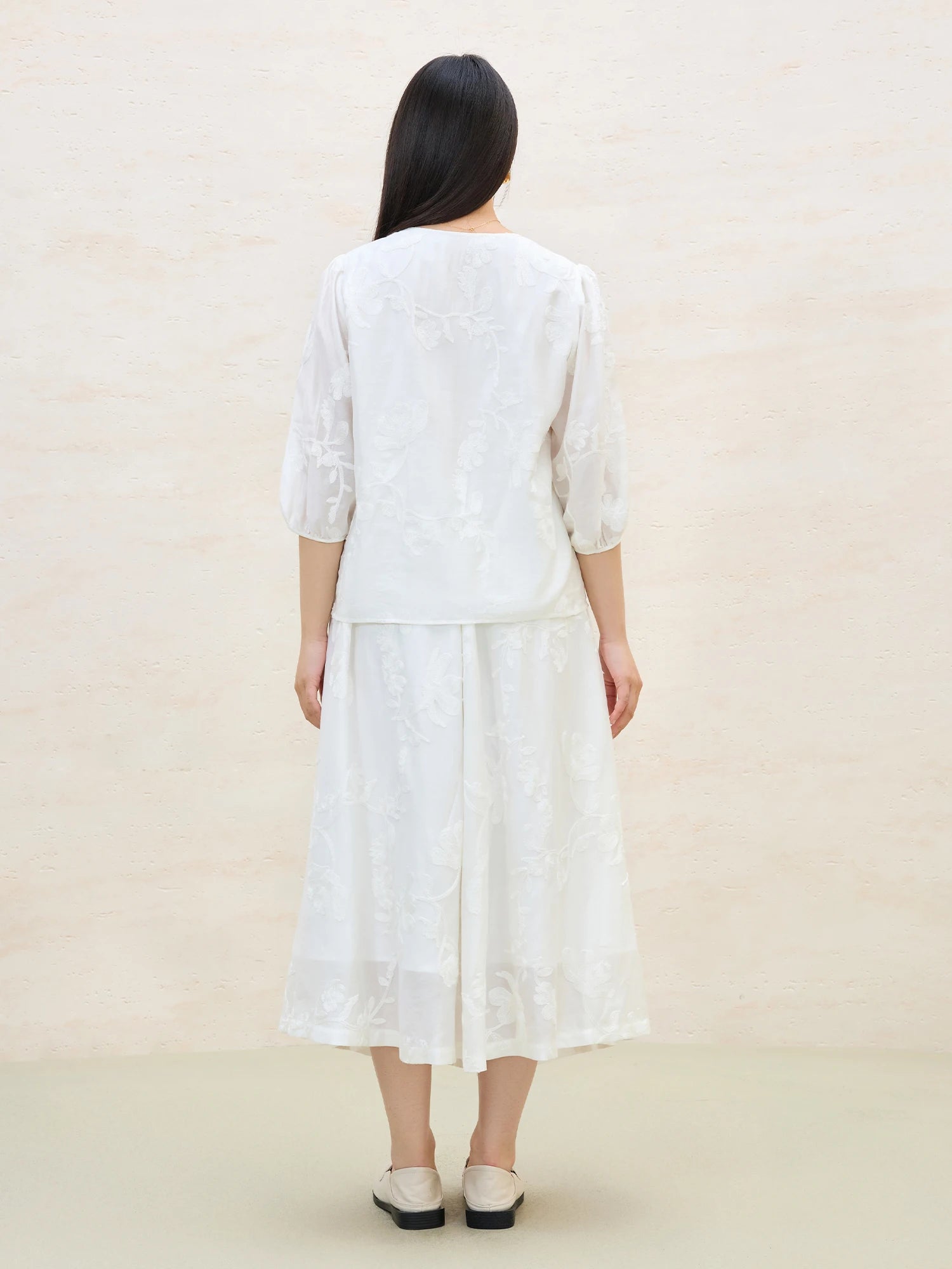 Langarm-Bluse mit V-Ausschnitt und Knopfleiste, tailliert mit Bindegürtel – ideal fürs Büro.