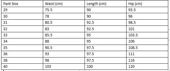size_info: {"sizeInfoList":[{"length":{"cm":"90","inch":"35.43"},"size":"29","vid":-1},{"length":{"cm":"90","inch":"35.43"},"size":"30","vid":-2},{"length":{"cm":"92.5","inch":"36.42"},"size":"31","vid":-3},{"length":{"cm":"92.5","inch":"36.42"},"size":"32","vid":-4},{"length":{"cm":"95","inch":"37.40"},"size":"33","vid":-5},{"length":{"cm":"95","inch":"37.40"},"size":"34","vid":-6},{"length":{"cm":"97.5","inch":"38.39"},"size":"35","vid":-7},{"length":{"cm":"97.5","inch":"38.39"},"size":"36","vid":-8},{"length":{"cm":"97.5","inch":"38.39"},"size":"38","vid":-9},{"length":{"cm":"100","inch":"39.37"},"size":"40","vid":-10}]}