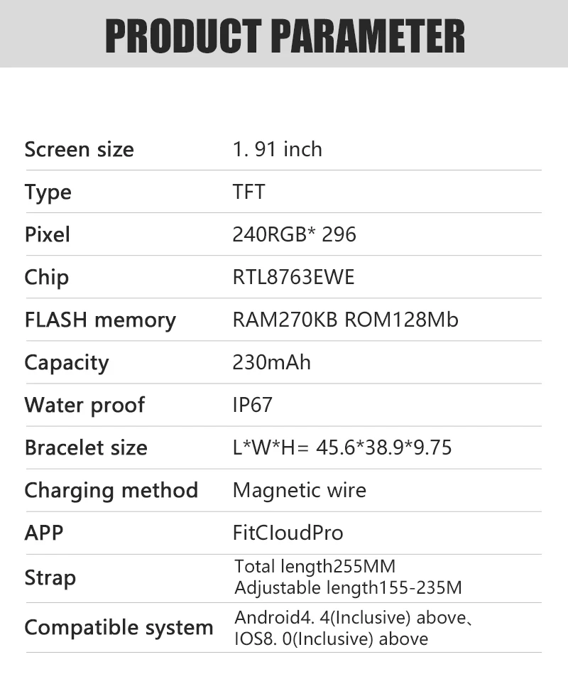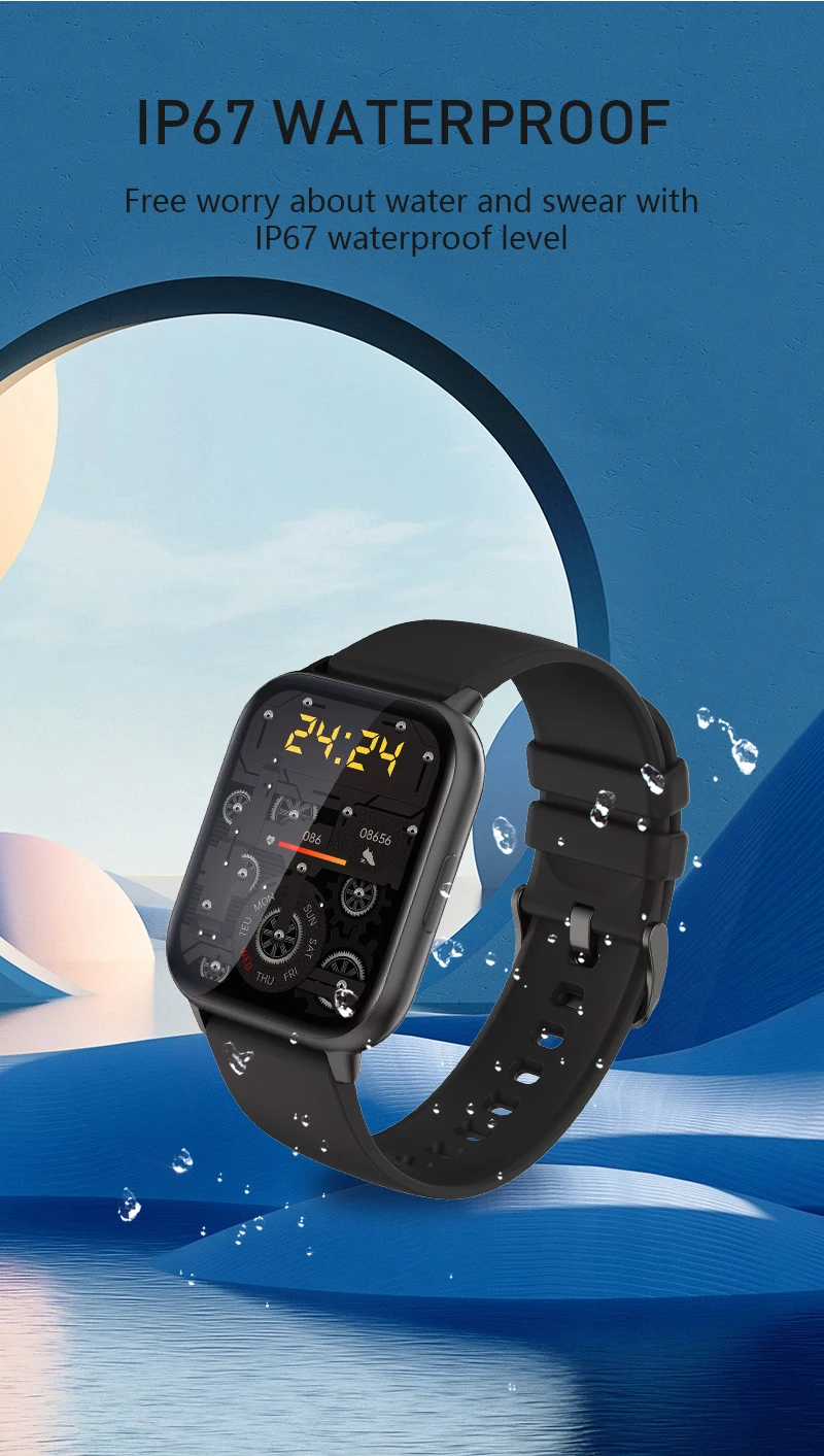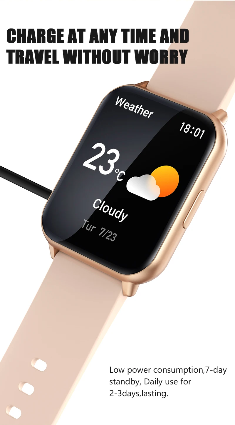 ★Weitere Funktionen: Schrittzähler, Schlaf, Herzfrequenz, Blutdruck, Spo2, Trainingsaufzeichnung, Zifferblattwahl, Push-Nachricht und App-Benachrichtigung, täglicher Wecker, Kamerasteuerung, Wetterinformationen, Finden Sie die Uhr, Zeitformat (12/24), DND-Moduszeit, ganztägige Herzfrequenzmessung, Handgelenk anheben, um den Bildschirm einzuschalten.