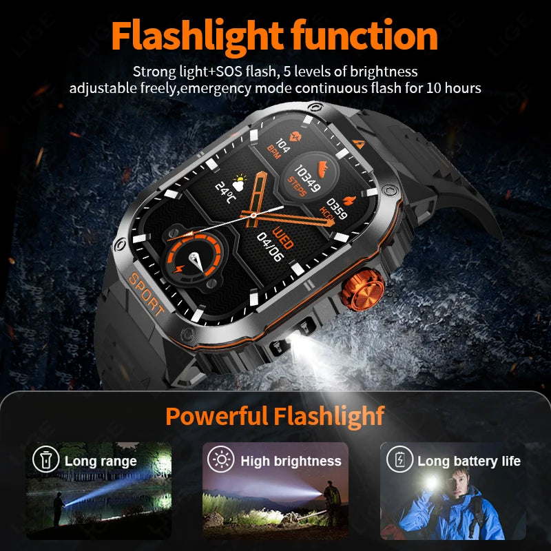 LIGE Militär Taschenlampe Smart Uhr Wasserdicht Herzfrequenz Fitness Sport Anruf Erinnerung Smartwatch Für IOS Android Telefon 2025