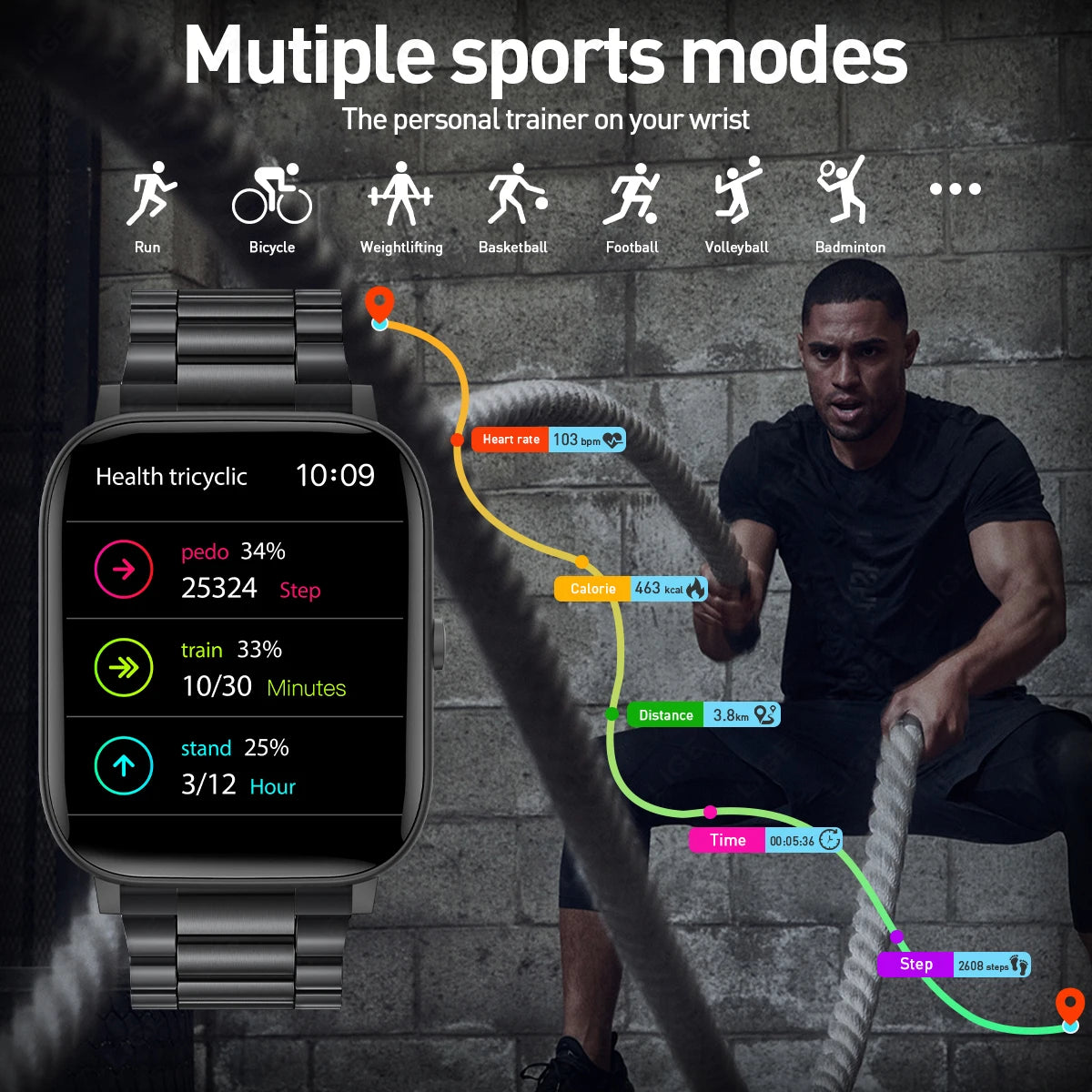 ★ Exercise: Multiple Sports Modes ( Running / Cycling / Strength Training / Basketball / Tennis / Volleyball / Football), Counting Steps, Exercise Time, Exercise Mileage, Calorie Consumption, Uploading APP to Save Exercise / Sleep Data.