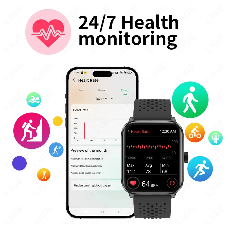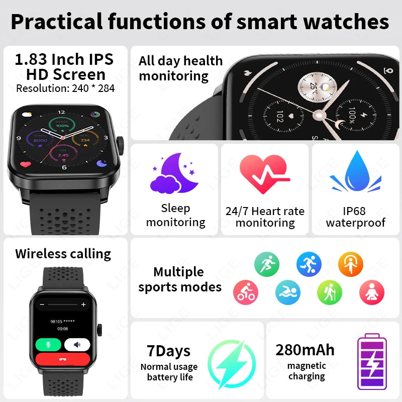 LIGE Neue Outdoor-Sport-GPS-Smartwatch für Herren, 1,83 Zoll, HD-Bildschirm, Telefonanrufe, Gesundheit, IP68, wasserdicht, für Herren, Smartwatch 2025.