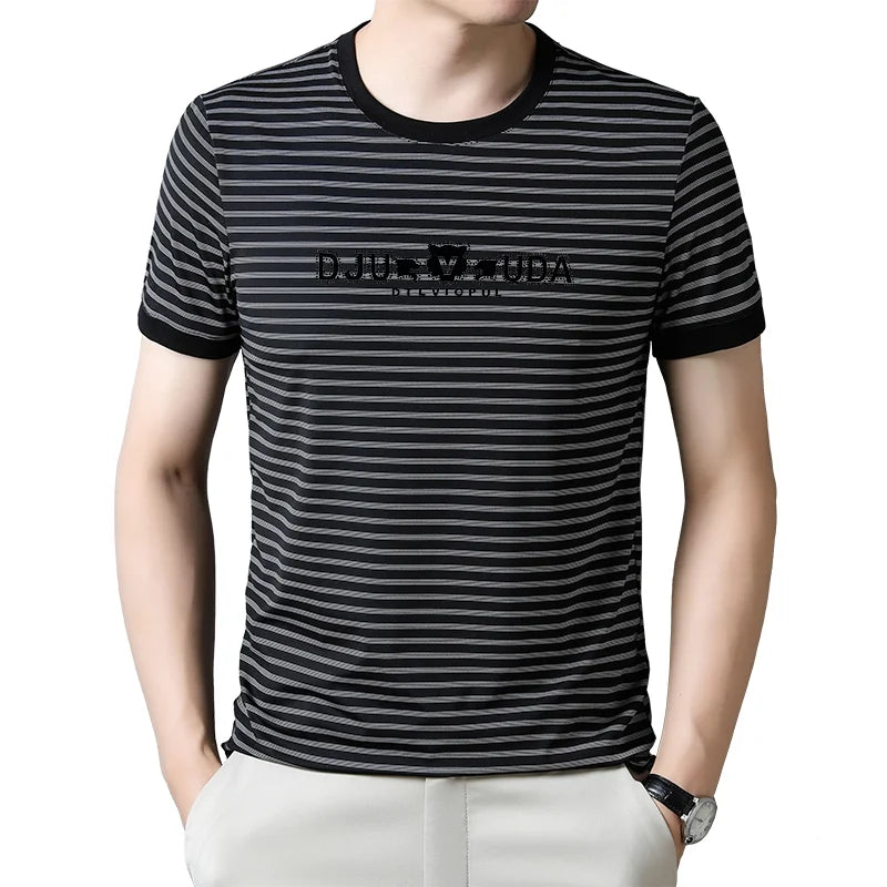 Dieses trendige Herren T-Shirt mit Hot Stamp im lässigen Streifendesign ist ideal für sommerliche Social Events. Aus hochwertigem feinem Wollstoff gefertigt, bietet es nicht nur einen modischen Look, sondern auch optimalen Tragekomfort. Perfekt für entspannte Anlässe, sorgt es dafür, dass Sie immer gut gekleidet sind.