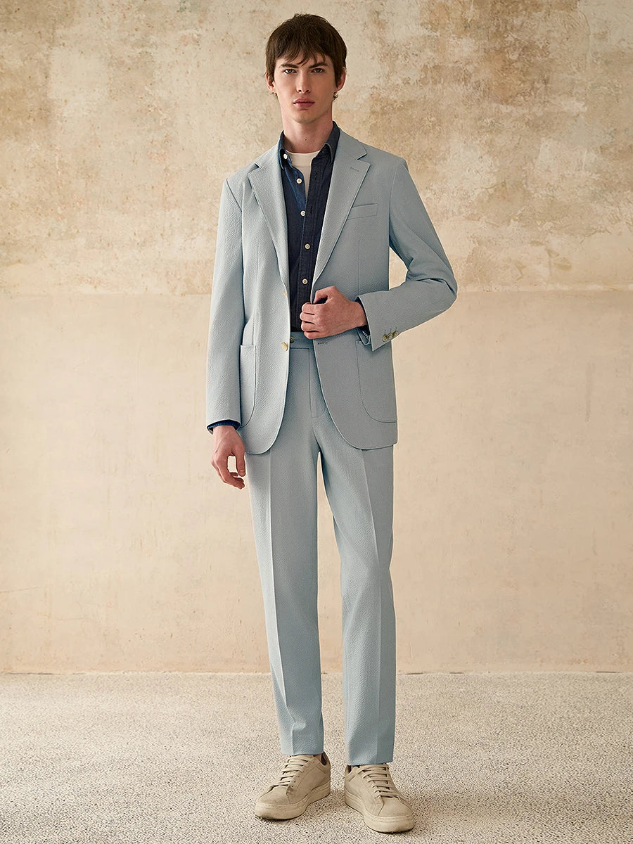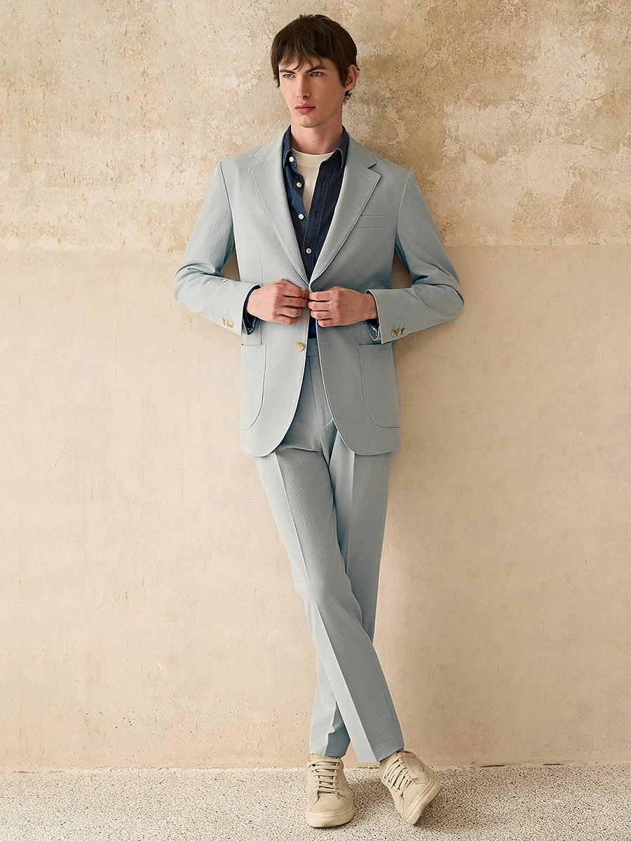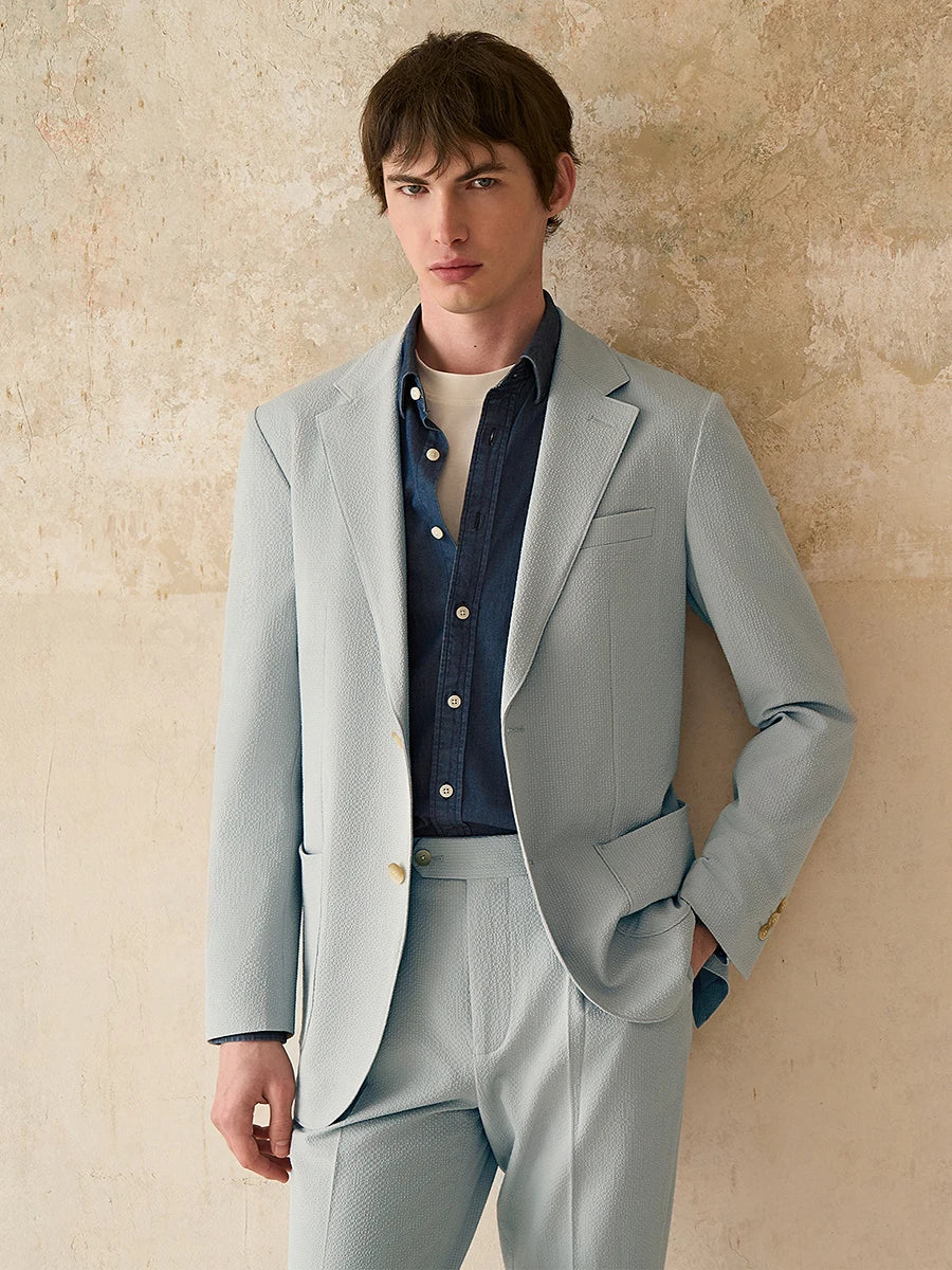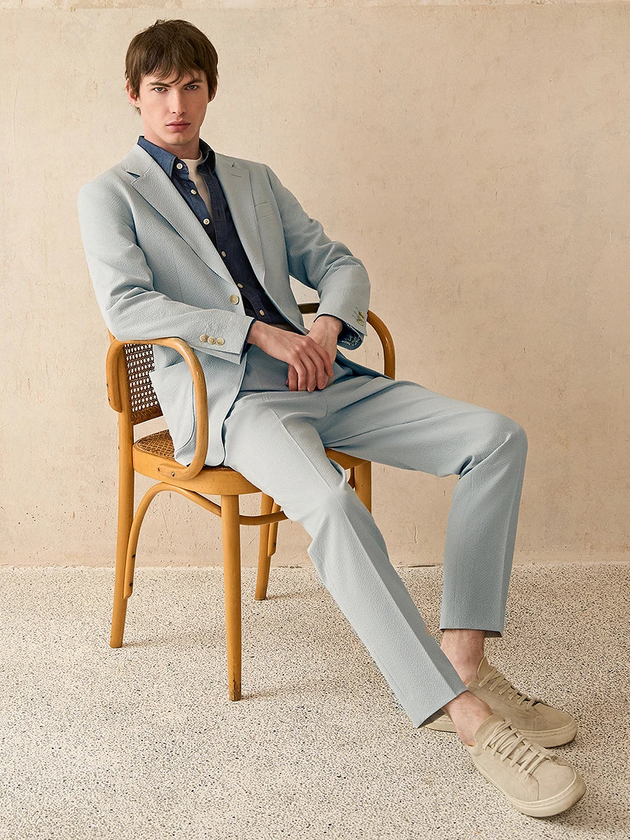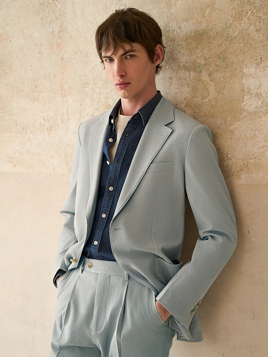 Dicker Herren-Doppelreiher-Sakko im Slim-Stil mit braunem Karomuster vereint modernes Design mit funktionalen Materialien. Ein vielseitiges Kleidungsstück für warme Tage – leger, praktisch und stilvoll zugleich.