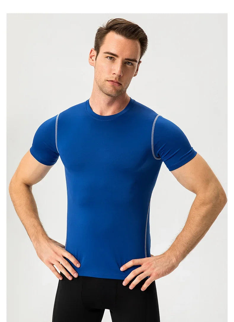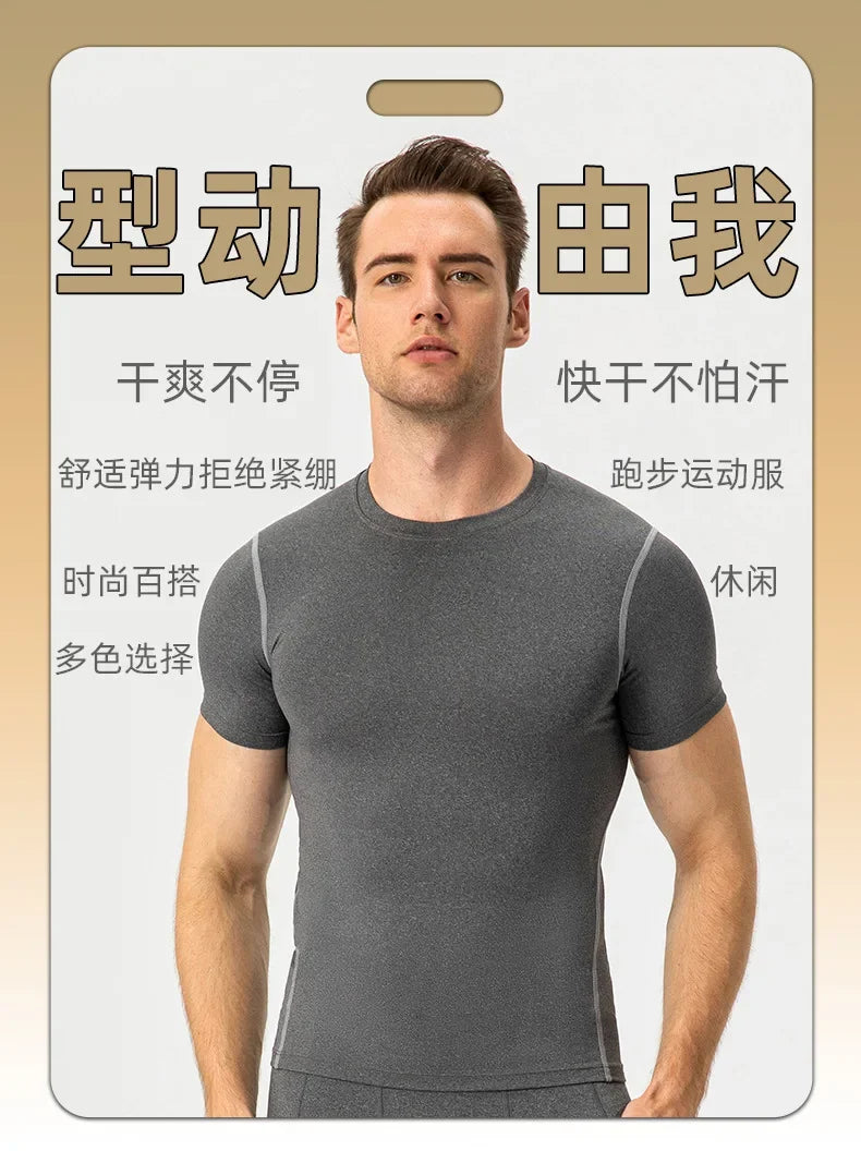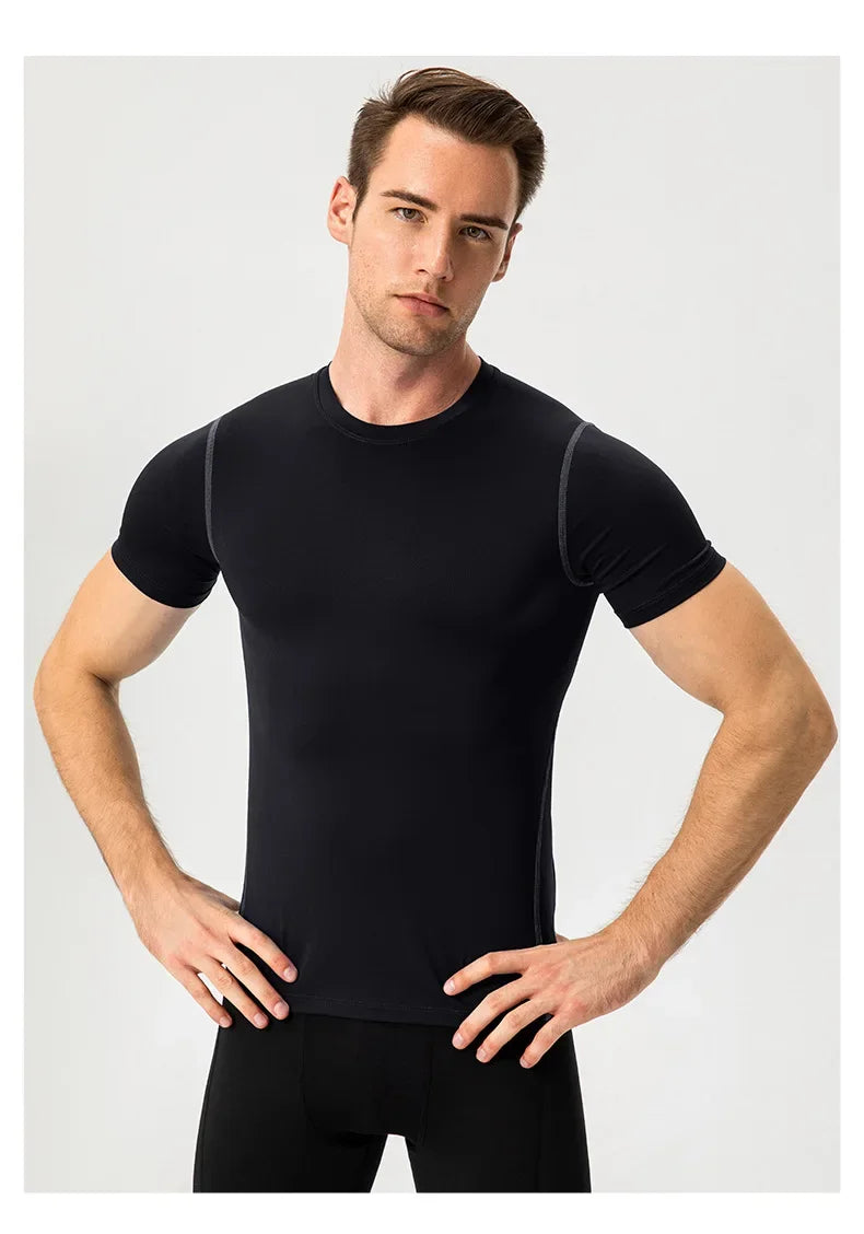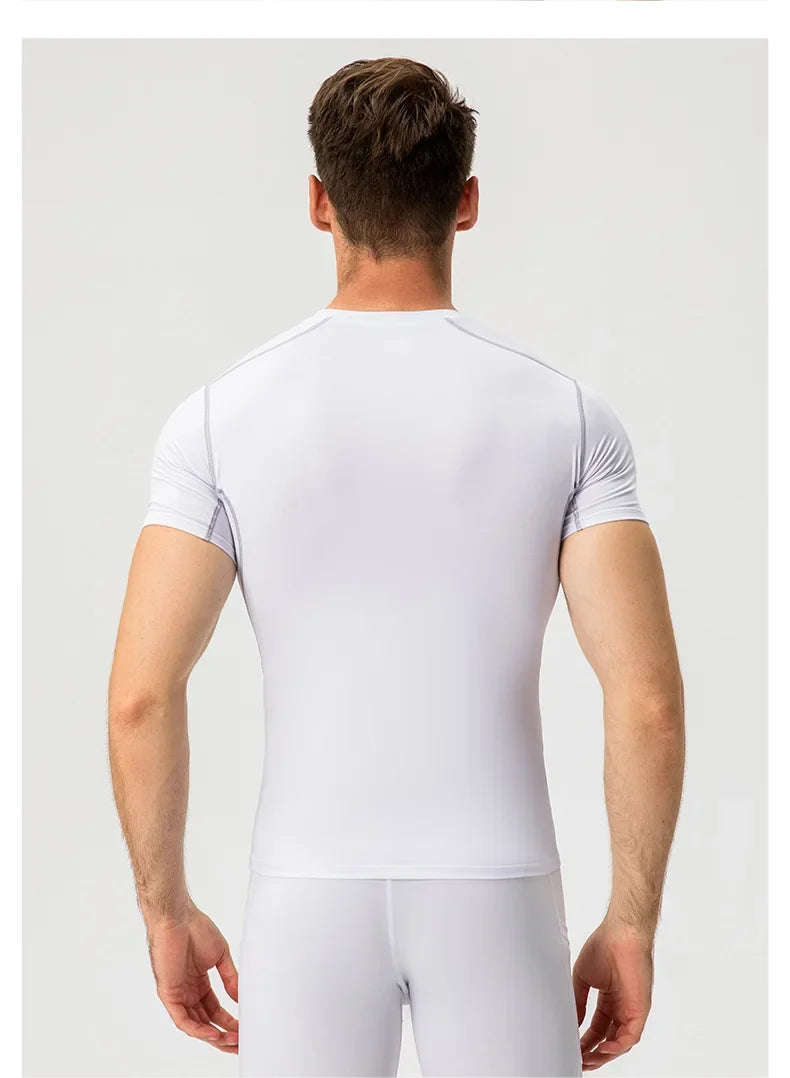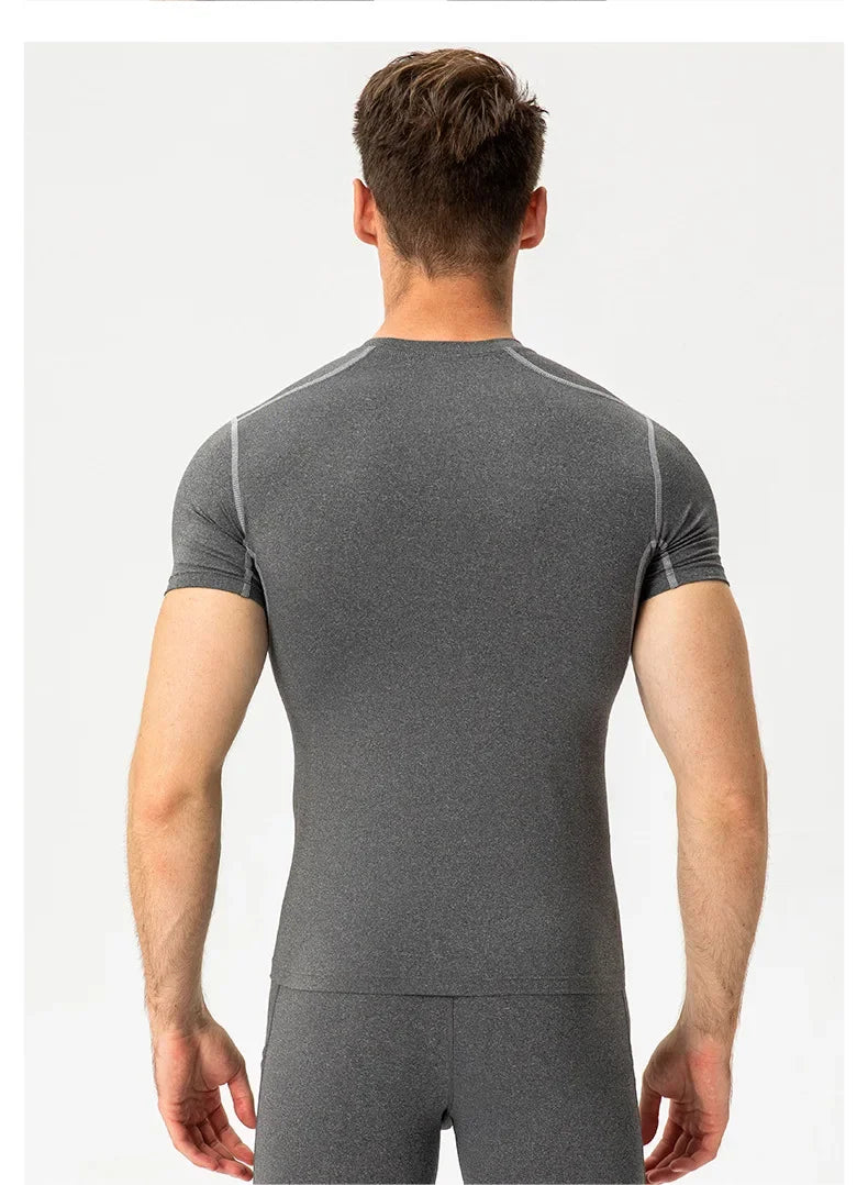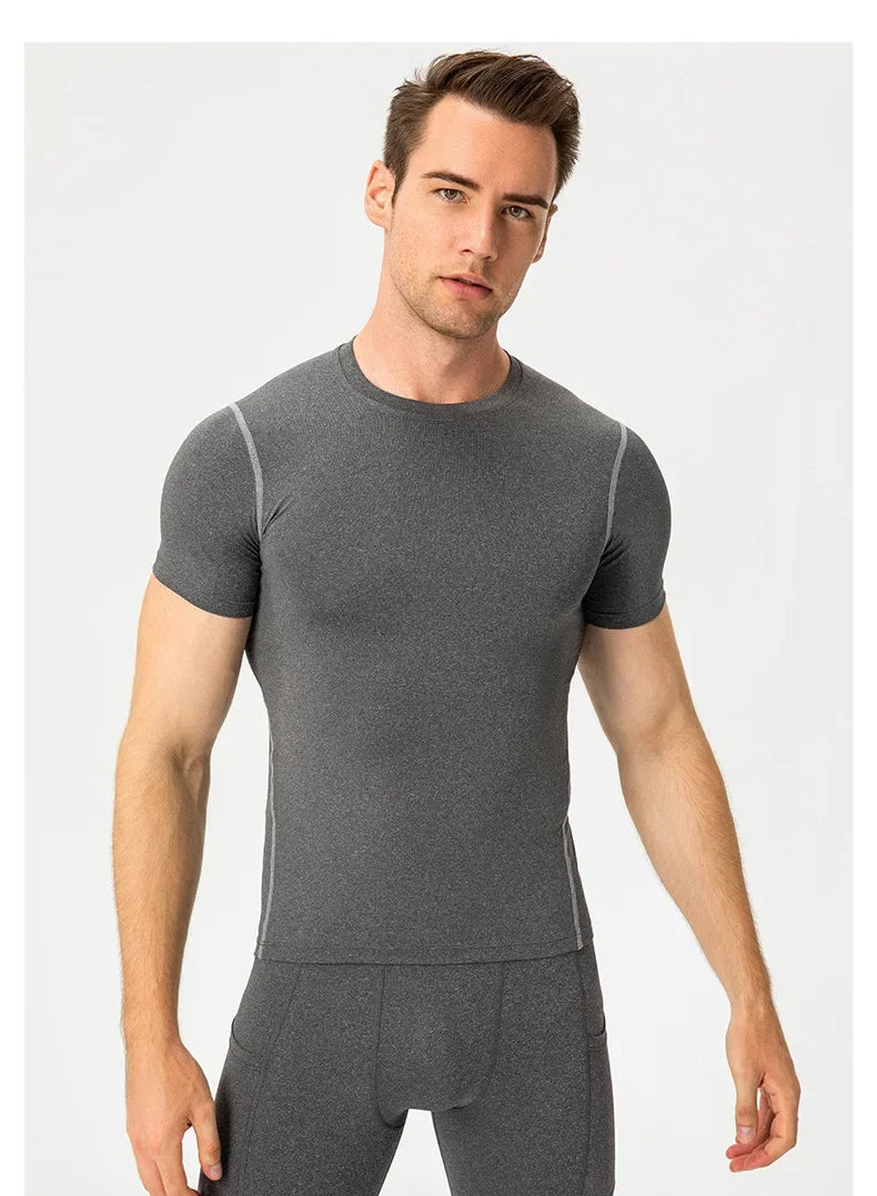 Eng anliegendes Herren-Fitness-Trainingsset mit kurzen Ärmeln – elastisch und schnelltrocknend, ideal für Sport und Laufen.