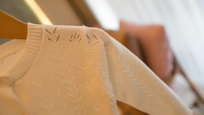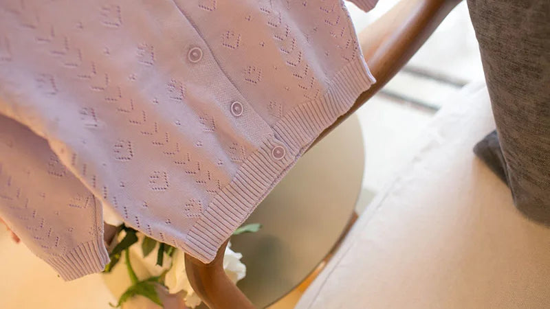 1.**Atmungsaktives, ausgehöhltes Design**: Das zarte ausgehöhlte Muster macht die Strickjacke hoch atmungsaktiv und eignet sich perfekt zum Tragen als klimatisiertes Hemd, damit Kinder sich in kühlen Innenräumen wohlfühlen.