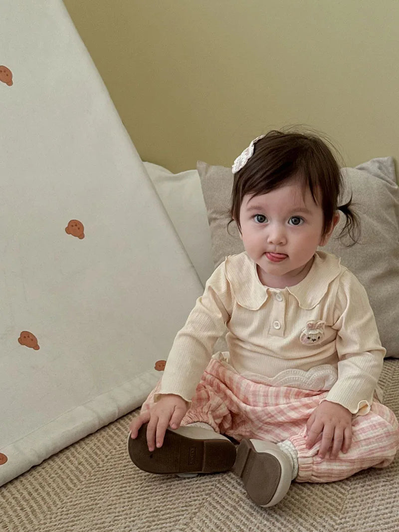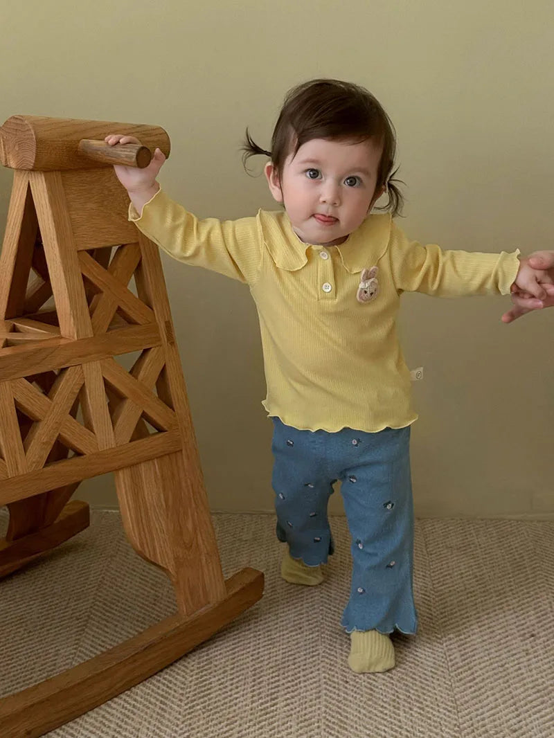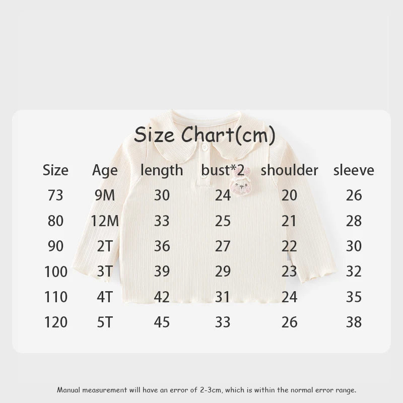 2.**Süßer Peter Pan-Kragen**: Der klassische Peter Pan-Kragen mit gerüschter Kante verleiht dem Hemd einen femininen und charmanten Look, geeignet für kleine Mädchen.