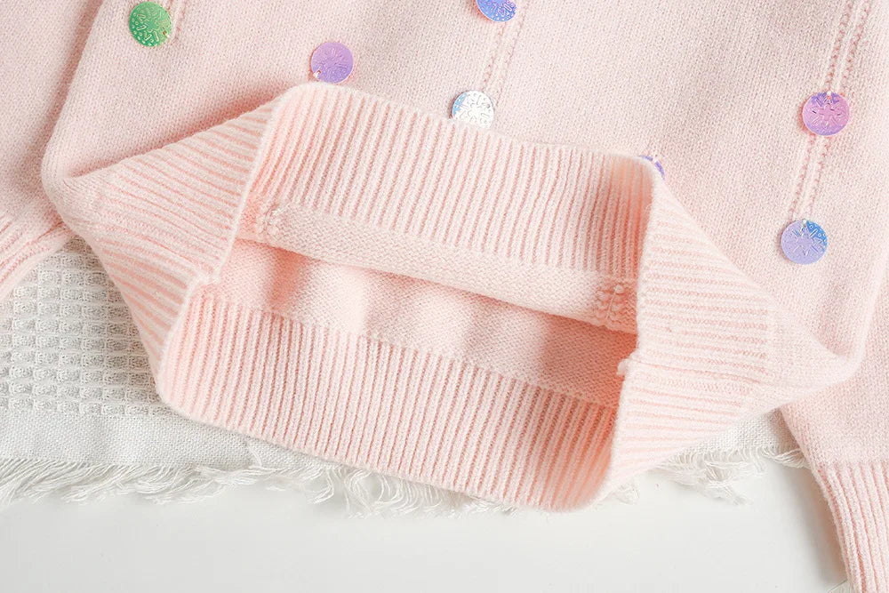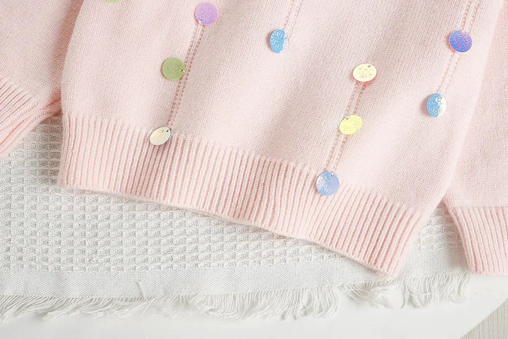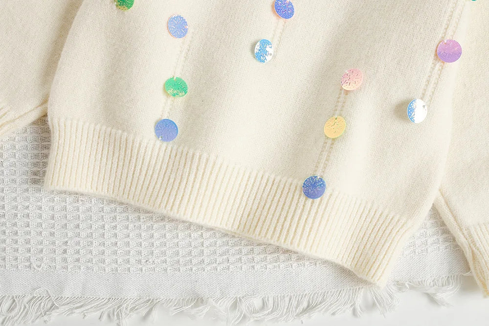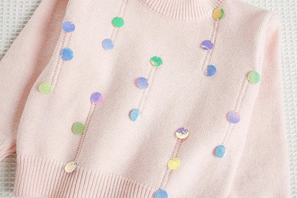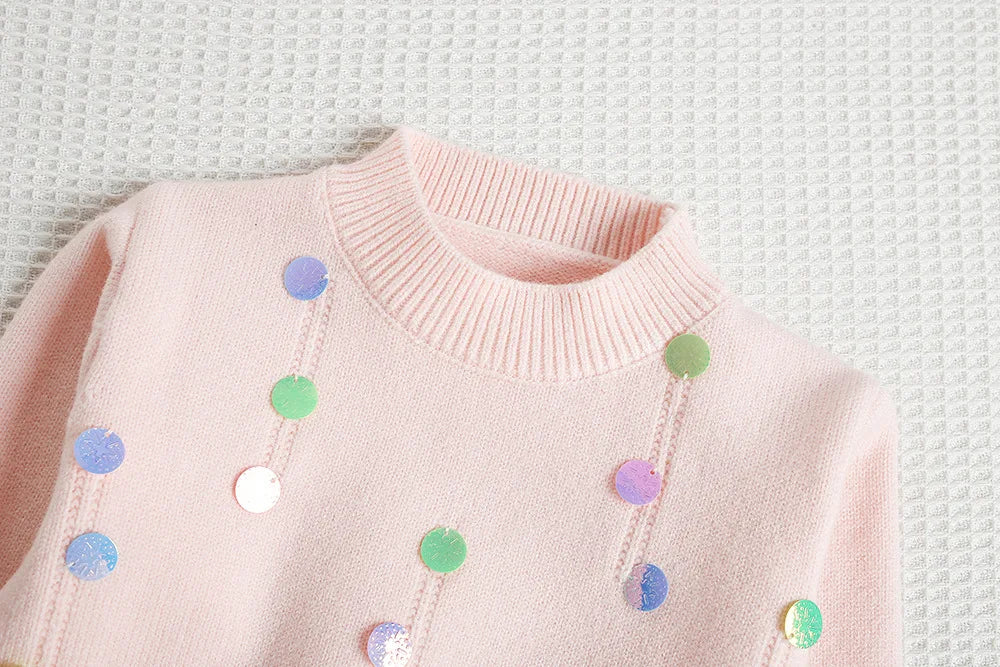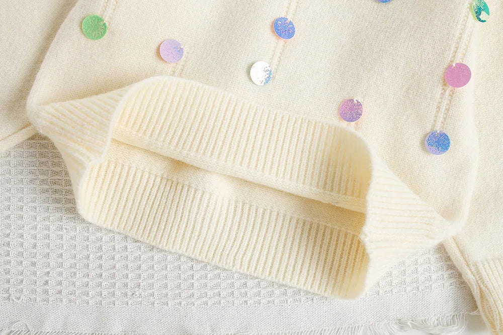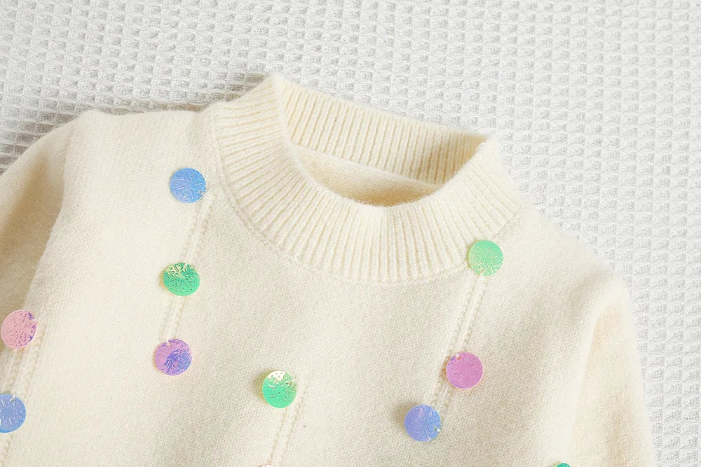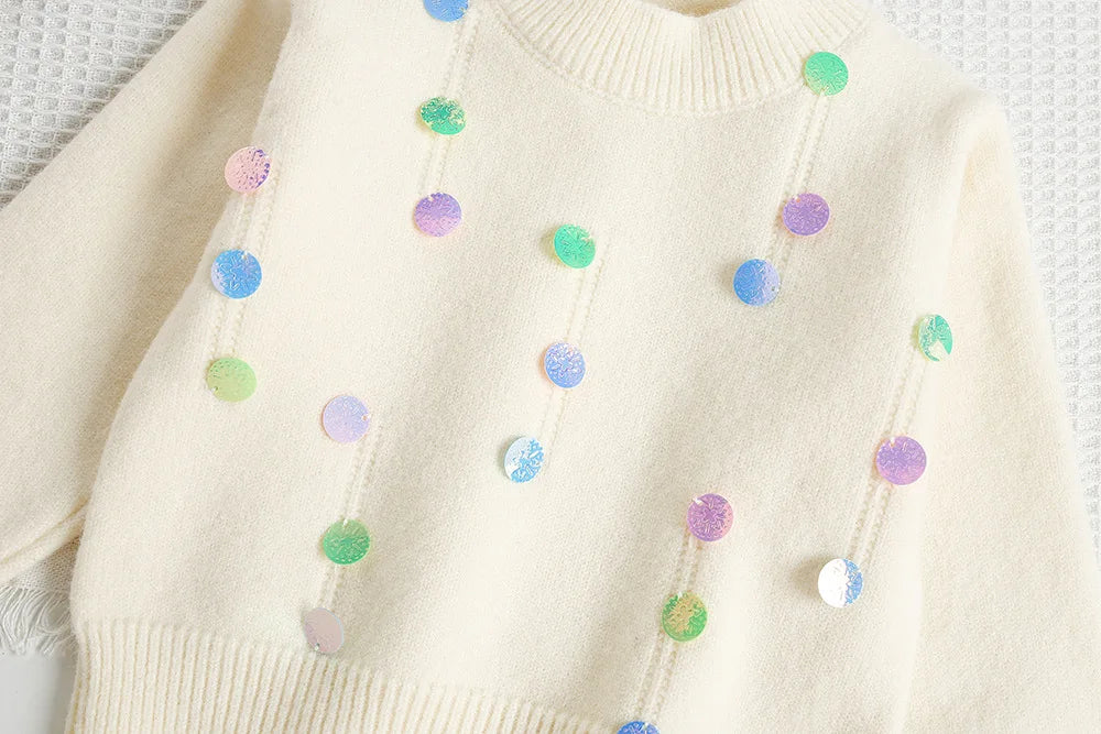 1.**Auffälliges Paillettendesign**:Bunte, runde Pailletten sind dekorativ auf dem Pullover angeordnet und sorgen für einen glänzenden und verspielten Look, der Kinder und Eltern ansprechen, die einzigartige Kinderkleidung suchen.