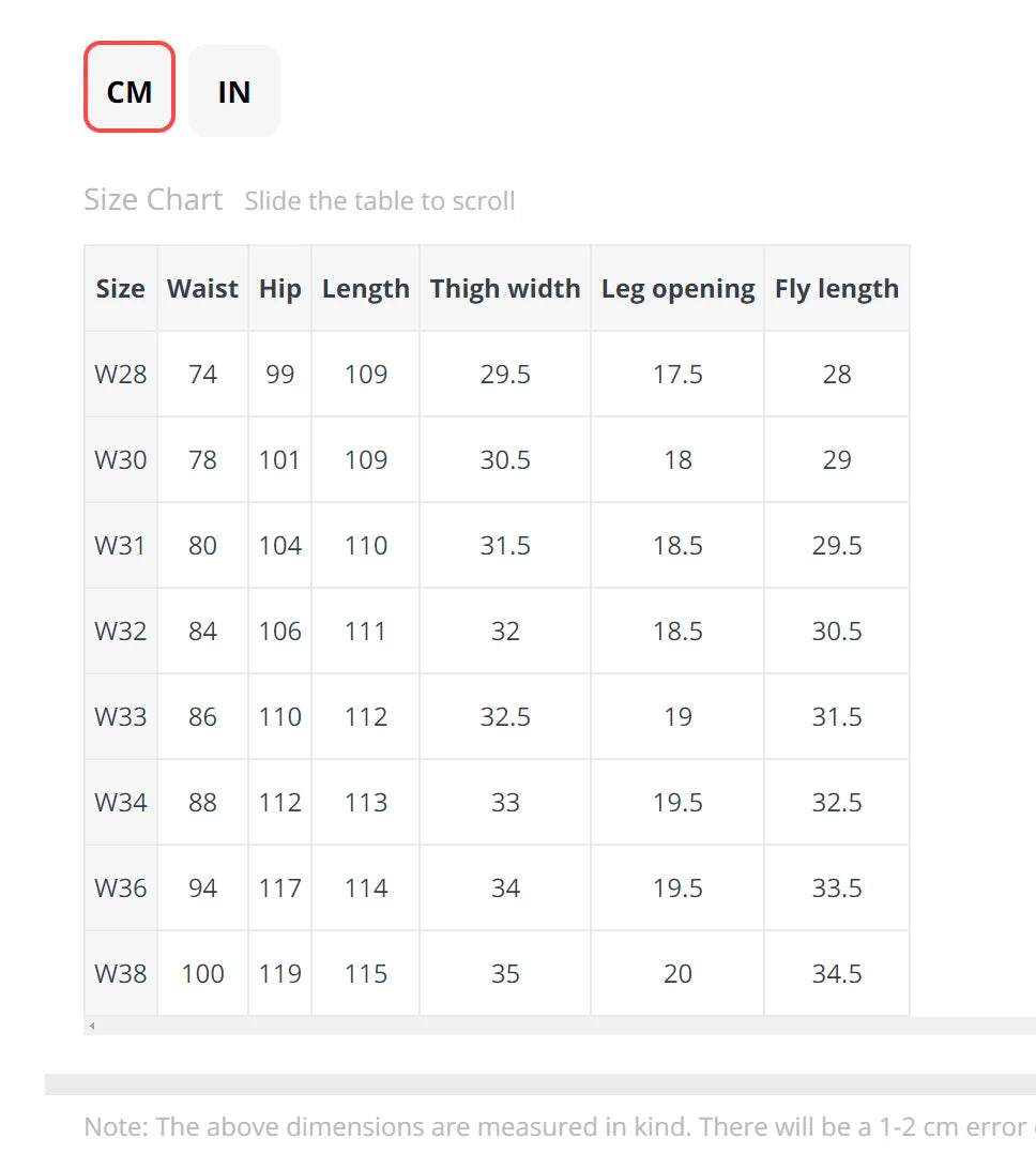 size_info: {"sizeInfoList":[{"length":{"cm":"74","inch":"29.13"},"size":"W28","vid":-200},{"length":{"cm":"78","inch":"30.71"},"size":"W30","vid":-201},{"length":{"cm":"80","inch":"31.50"},"size":"W31","vid":-202},{"length":{"cm":"84","inch":"33.07"},"size":"W32","vid":-203},{"length":{"cm":"86","inch":"33.86"},"size":"W33","vid":-204},{"length":{"cm":"88","inch":"34.65"},"size":"W34","vid":-205},{"length":{"cm":"94","inch":"37.01"},"size":"W36","vid":-206},{"length":{"cm":"100","inch":"39.37"},"size":"W38","vid":-261}]}