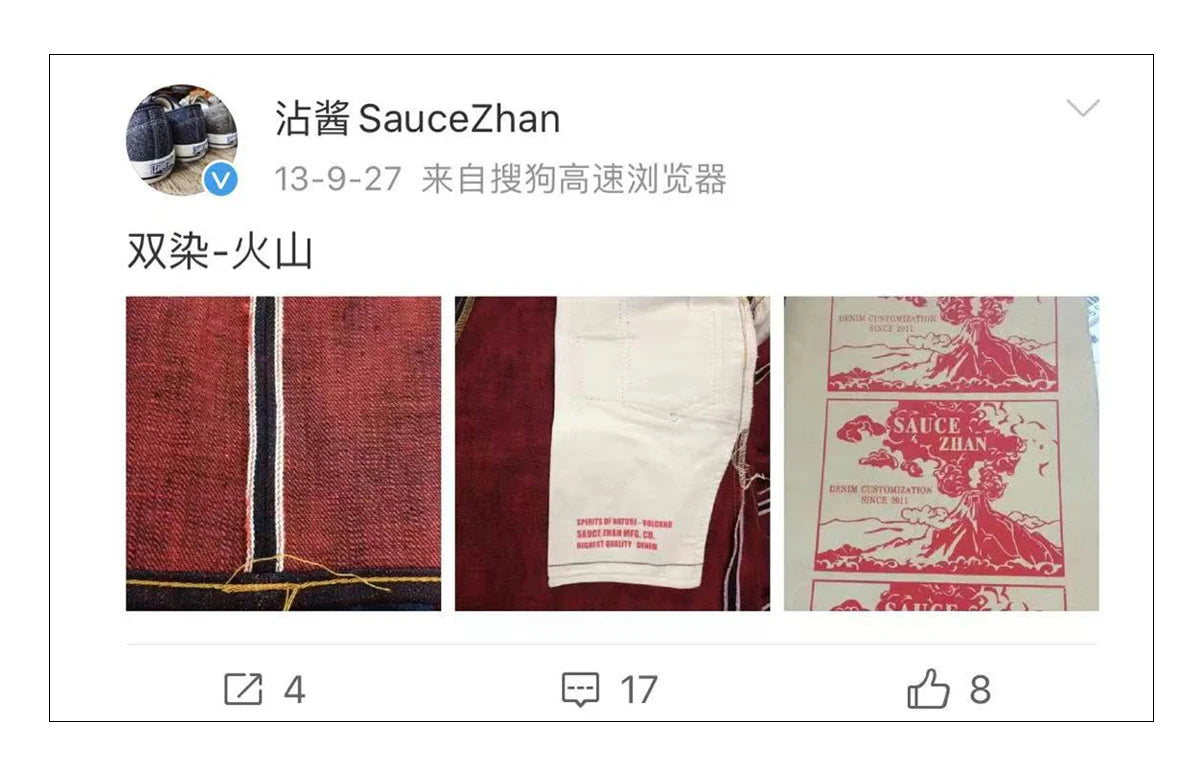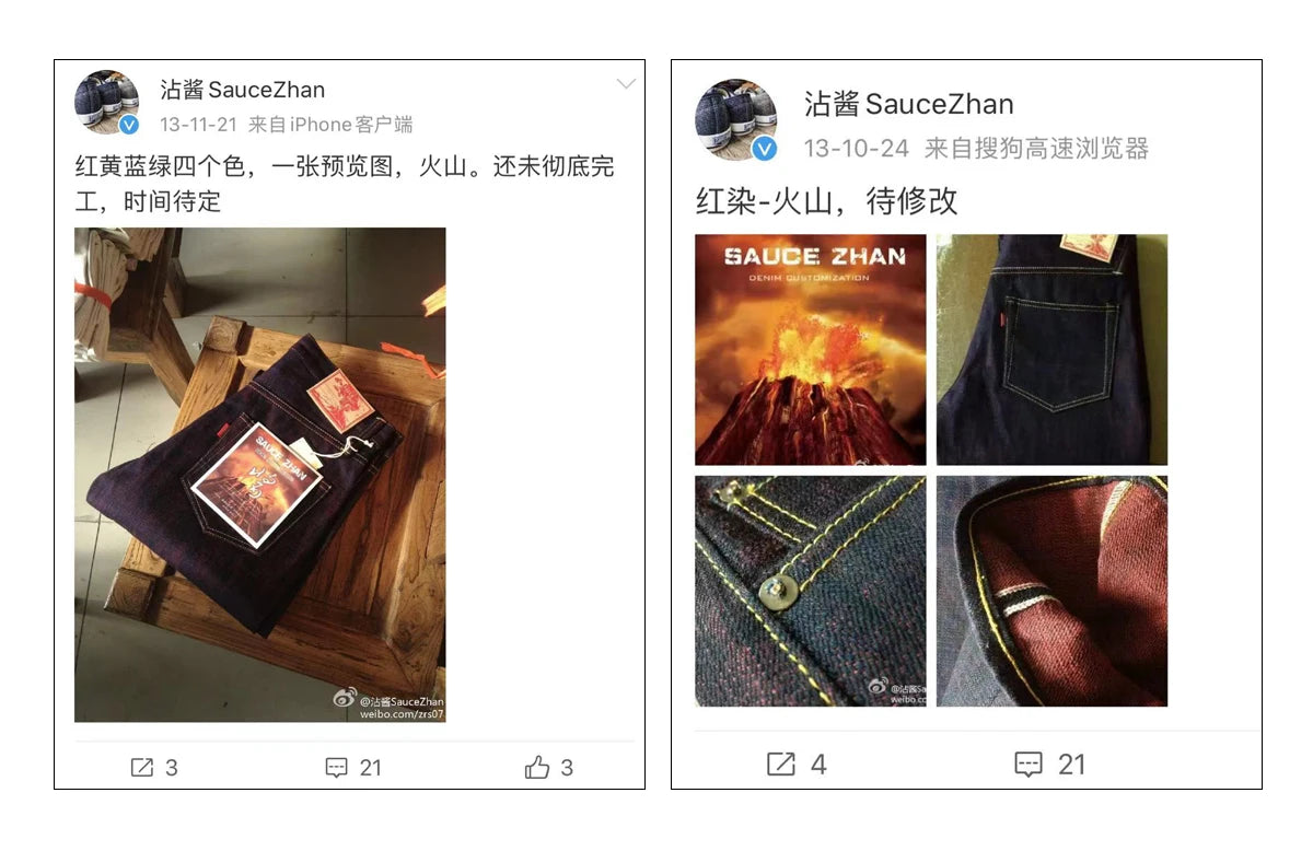 Die Geister der Natur Serie Jeans, ihre erste Version wurde im Jahr 2013 produziert, saucezhan zuerst versucht doppelseitig gefärbte Jeans in China.