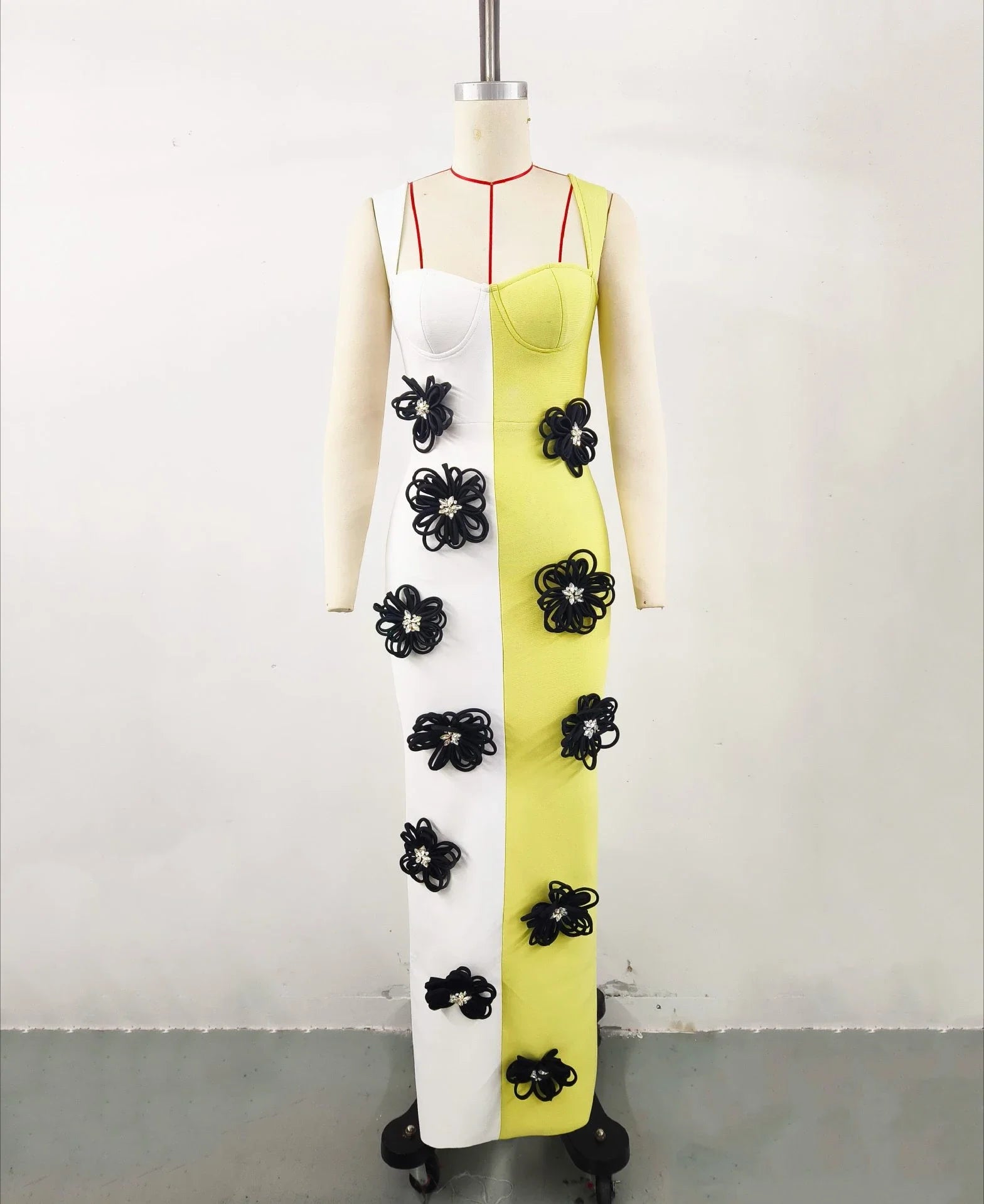 Langes Damen-Kleid mit Rundhalsausschnitt, Rüschen und Patchwork-Design – locker geschnitten und einreihig geknöpft.