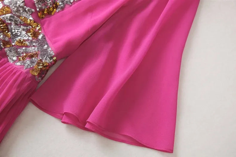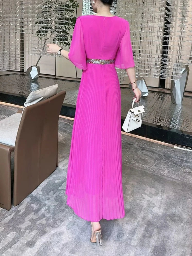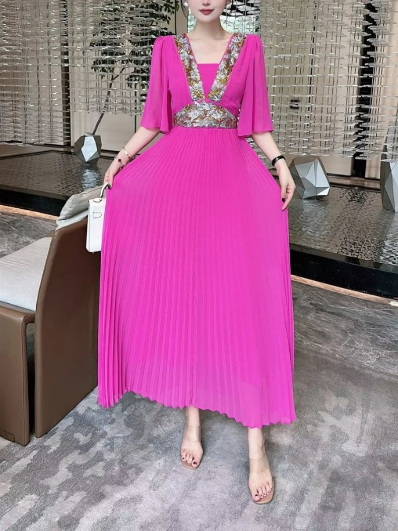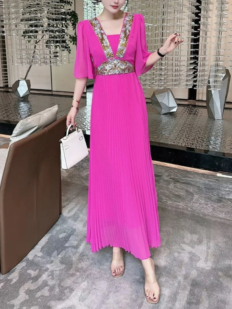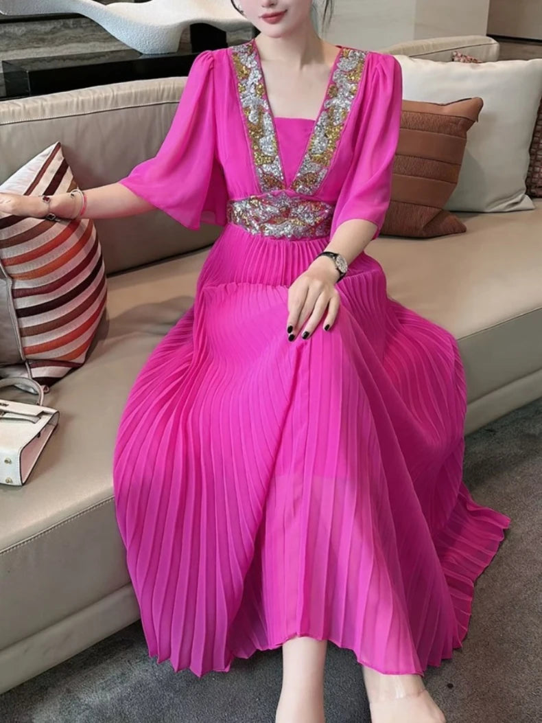 Elegantes Damenkleid mit Rundhalsausschnitt, langen Ärmeln und Perlen-Patchwork – figurbetontes Design für stilvolle Anlässe
