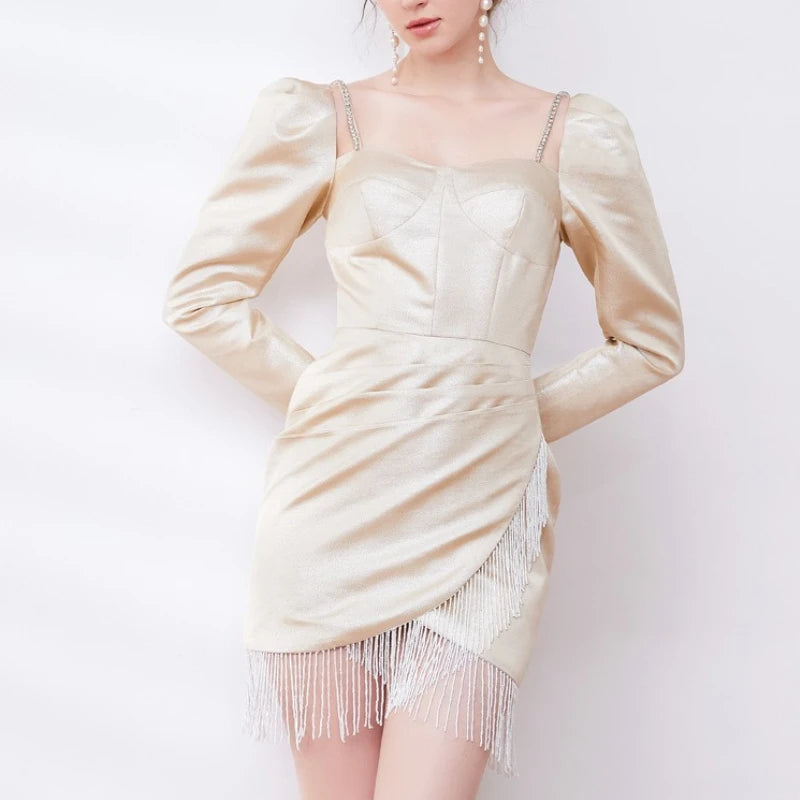 Elegantes Damenkleid mit hohlem Design, Perlenverzierung und hohem Kragen – Langarm-Patchwork mit Schlitz.