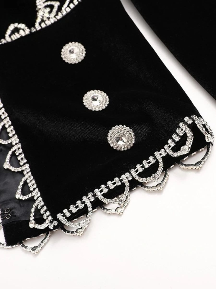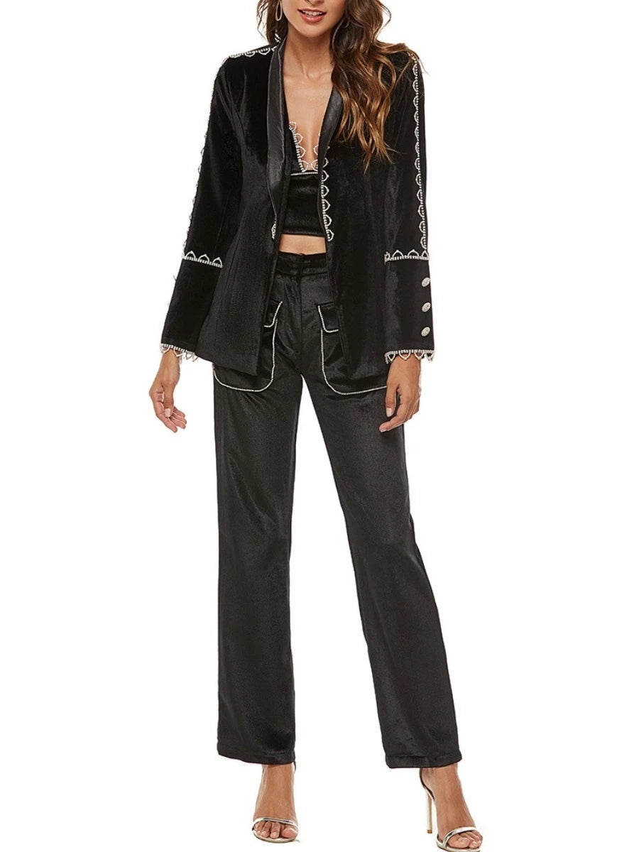 Elegantes Damen-Zweiteiler-Set mit V-Ausschnitt, langen Ärmeln und Perlenverzierung – Patchwork-Top mit Knöpfen und hoch taillierte Hose