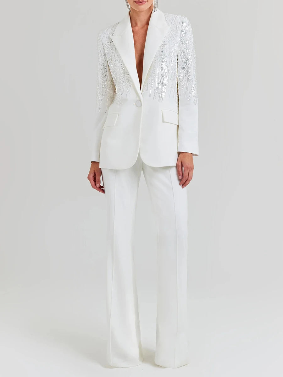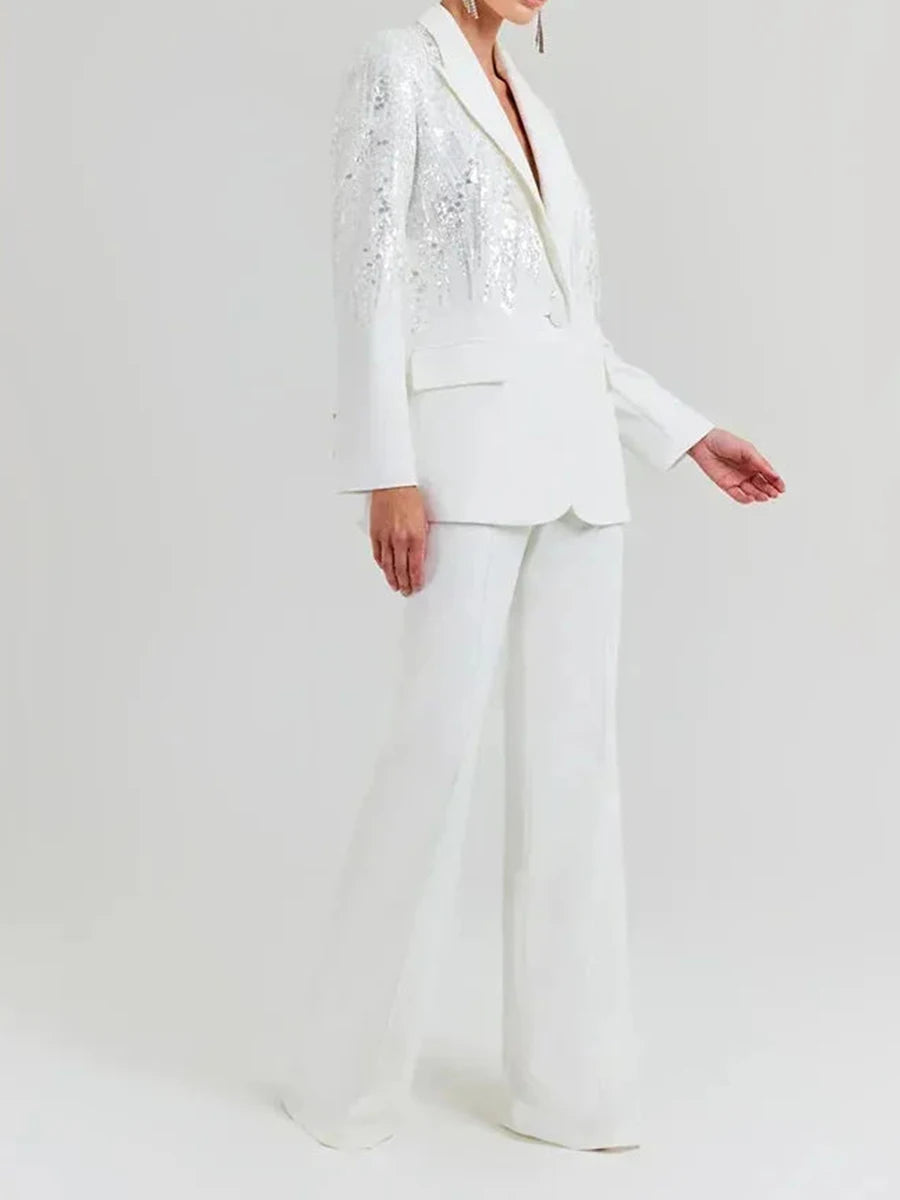 Elegantes Damen-Zweiteiler-Set mit langärmligem Kragenoberteil und hoch taillierter Hose mit Diamantdetails und Schlitz.